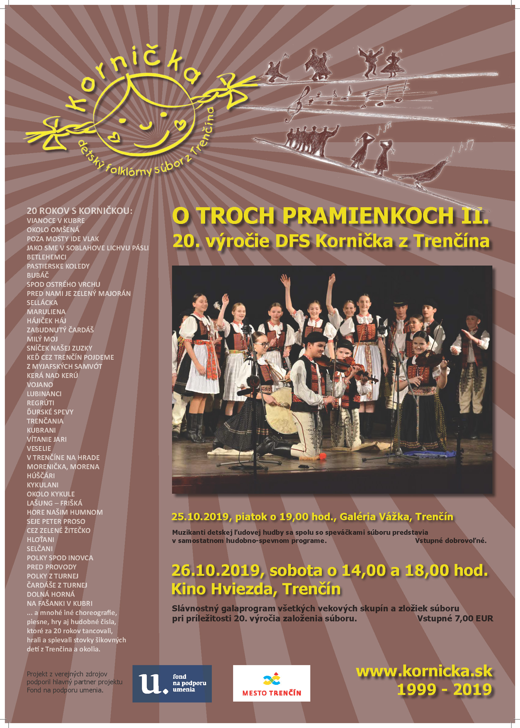 Detský folklórny súbor Kornička oslavuje 20.výročie svojho vzniku. Pri tejto príležitosti pripravil súbor samostatný koncert ľudovej hudby a speváckej skupiny a tiež slávnostný galaprogram "O troch pramienkoch II.". Ten je voľným pokračovaním rozprávkového príbehu "O troch pramienkoch", ktorý bol uvedený v roku 2014 pri príležitosti 15.výročia založenia DFS Kornička.