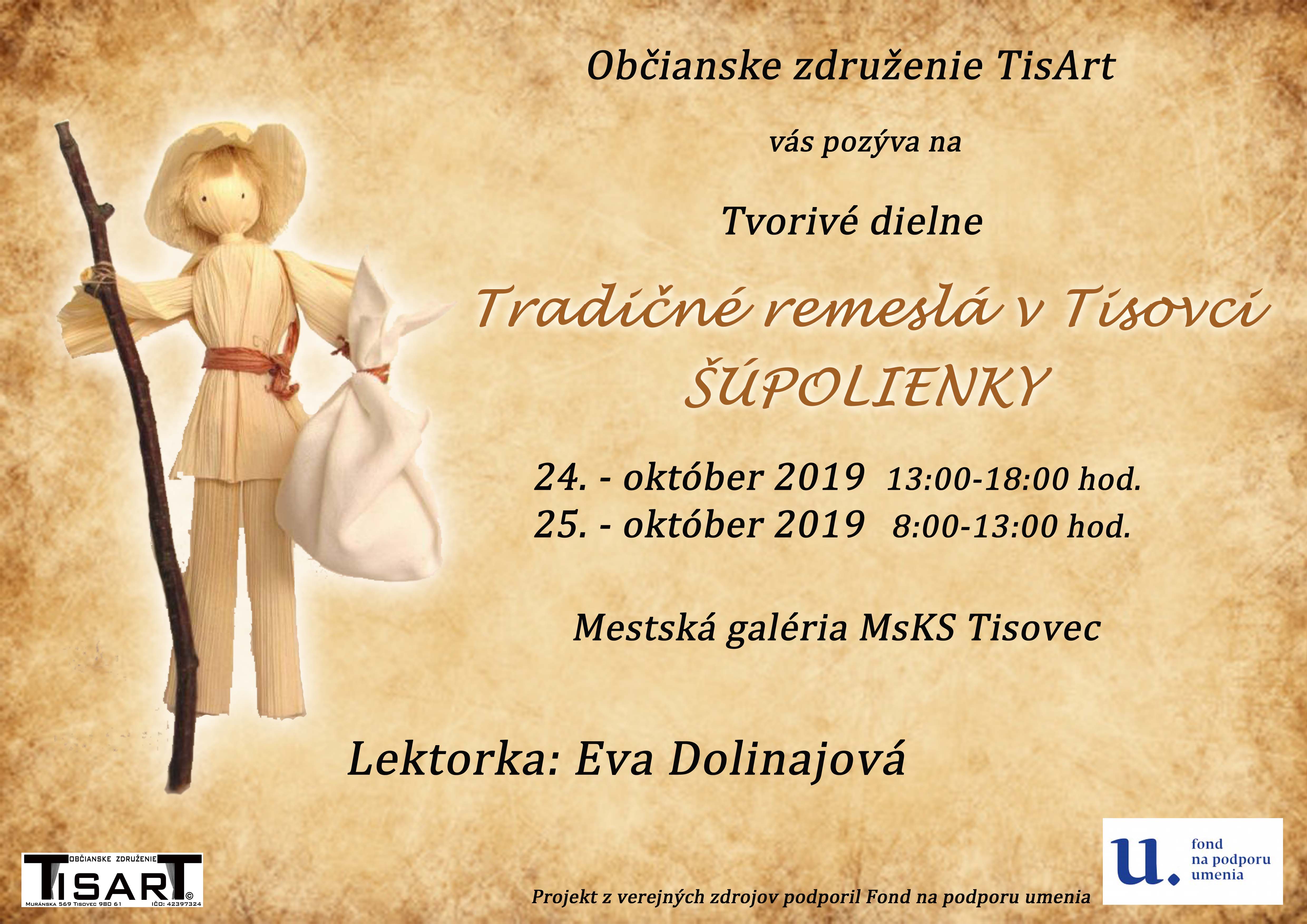 Občianske združenie TisArt, Vás pozýva na tvorivé dielne v rámci projektu "Tradičné remeslá v Tisovci. Je to pilotný projekt, ktorým zámerom je zmapovať a zdokumentovať tradičné remeslá v Tisovci. Súčasťou projektu je prezentácia techniky výroby a tvorivé dielne pre aj pre mladšie generácie.