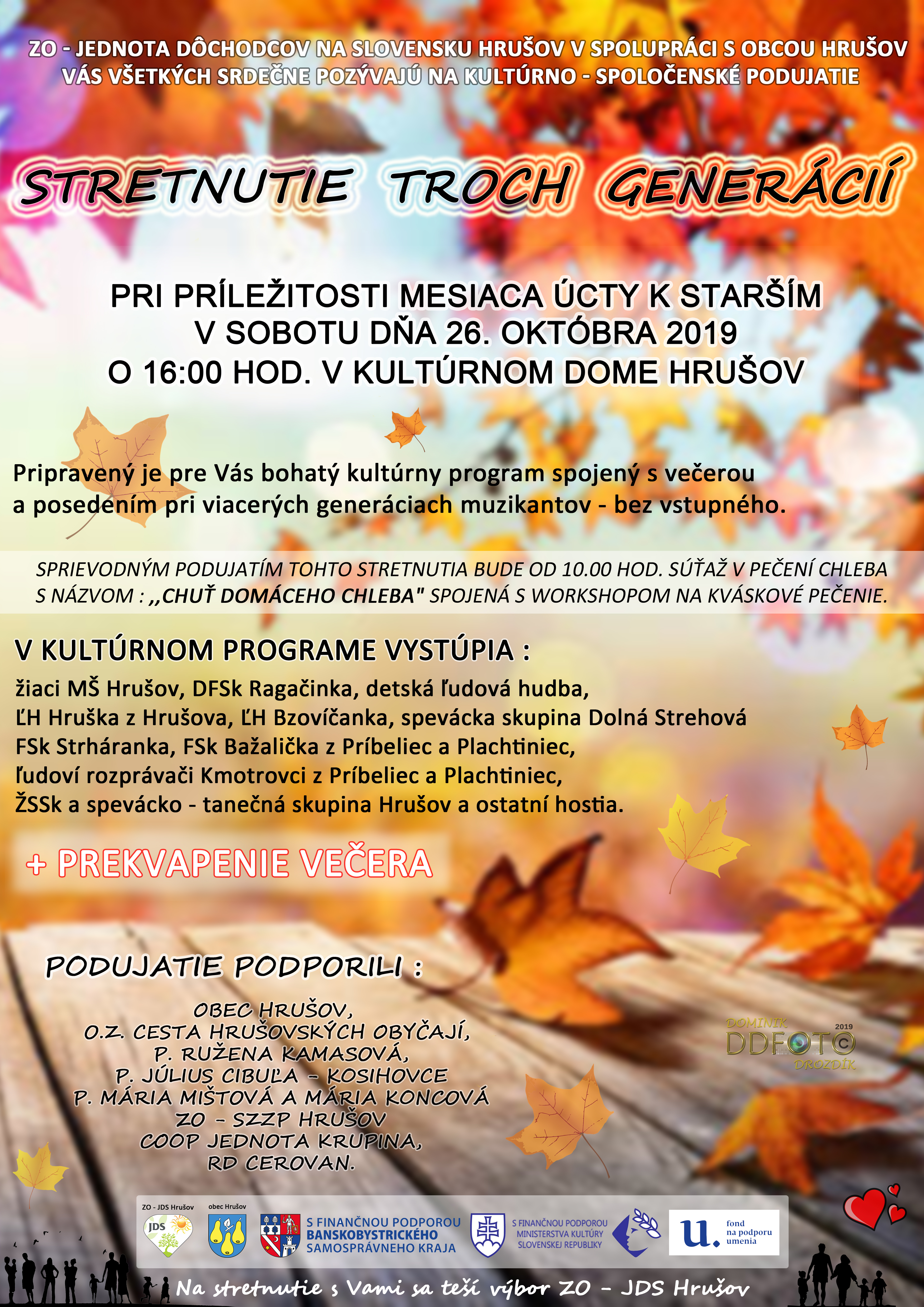 Stretnutie troch generácií, ktorého hlavnou myšlienkou je upevnenie medzigeneračných väzieb, budovanie spolupráce, dobrých vzťahov a úcty medzi mladou a najstaršou generáciou. Odovzdávanie tradícií, poznatkov a skúseností starších mladším, ale i spríjemnenie a spestrenie jesene života našim starším spoluobčanom.