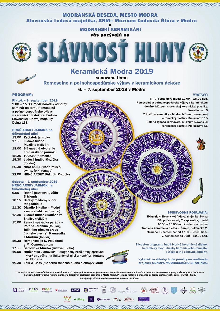 11. ročník Slávnosti hliny – Keramickej Modry, s témou Remeselným a poľnohospodárskym výjavom v keramickom dekóre, je oslavou kumštu majstrov hrnčiarov a keramikárov. Ponúka hrnčiarsky jarmok keramikárov zo Slovenska aj zahraničia s bohatým programom a ukážkami remesla, odborný medzinárodný seminár i otvorené dvere v keramických dielňach. Dvojdňový festival je tradične súčasťou Dní európskeho kultúrneho dedičstva. Viac informácií nájdete na www.modranska-beseda.sk a facebooku Modranskej Besedy.