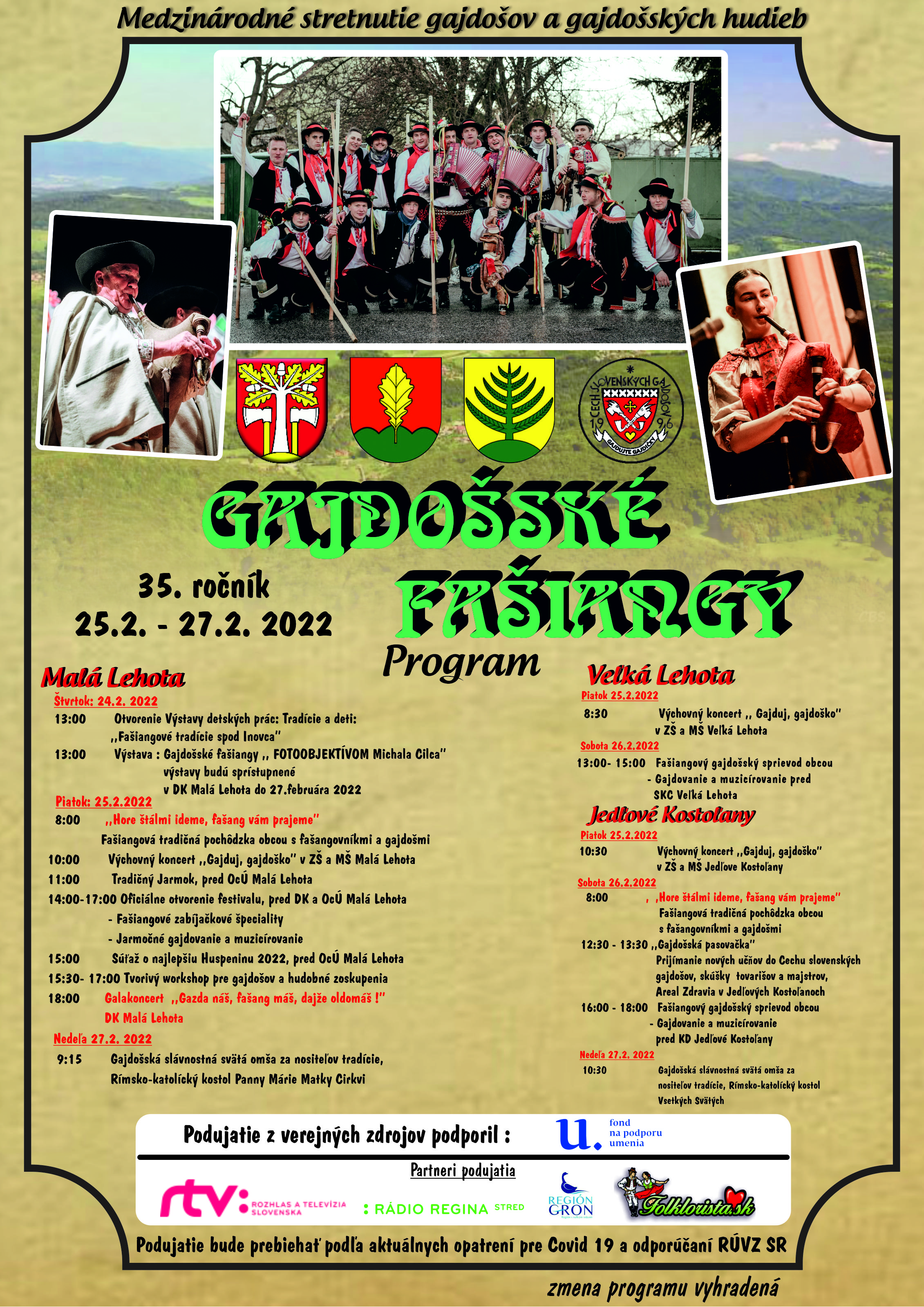 Jedinečný festival s pravou fašiangovou atmosférou v trojlístku Gajdošských obcí: Malá Lehota, Veľká Lehota a Jedľové Kostoľany. Tradične ustálený priebeh, ktorý začína fašiangovými pochôdzkami mládencov spolu s gajdošmi cez všetky štále, od domu k domu. Bohatý piatkový program si vychutná každý milovník tradičnej kultúry a večerný program Galakoncertu ponúka to najlepšie z gajdošského repertoáru SR i zahraničia. S bohatým a tradičným programom sa pokračuje aj cez víkend v gajdošských obciach.