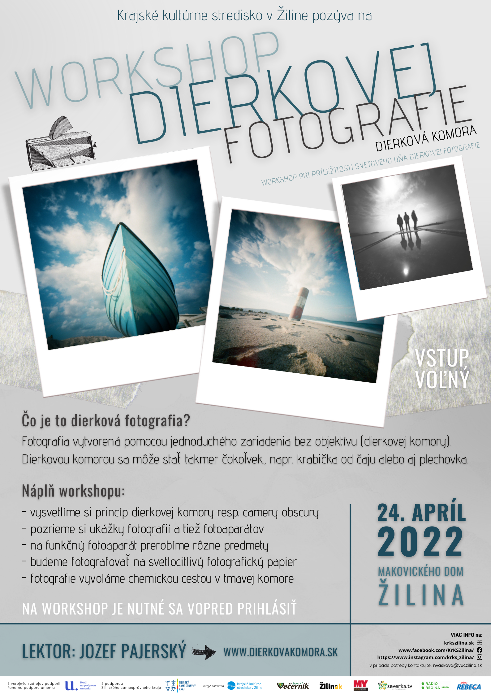 Dierková fotografia vzniká cez technológiu dierkovej komory - camery obscury. Takáto fotografia je vytvorená pomocou jednoduchého zariadenia bez objektívu. Zariadením alebo predmetom sa teda môže stať takmer čokoľvek, ideálne predmety sú napr.: krabička od čaju alebo plechovka. Jednodňový vzdelávací foto-workshop je určený najmä pre záujemcov o vyvolávanie fotografií tradičným spôsobom - chemickou cestou v tmavej komore. Workshop je realizovaný v rámci Svetového dňa dierkovej fotografie.