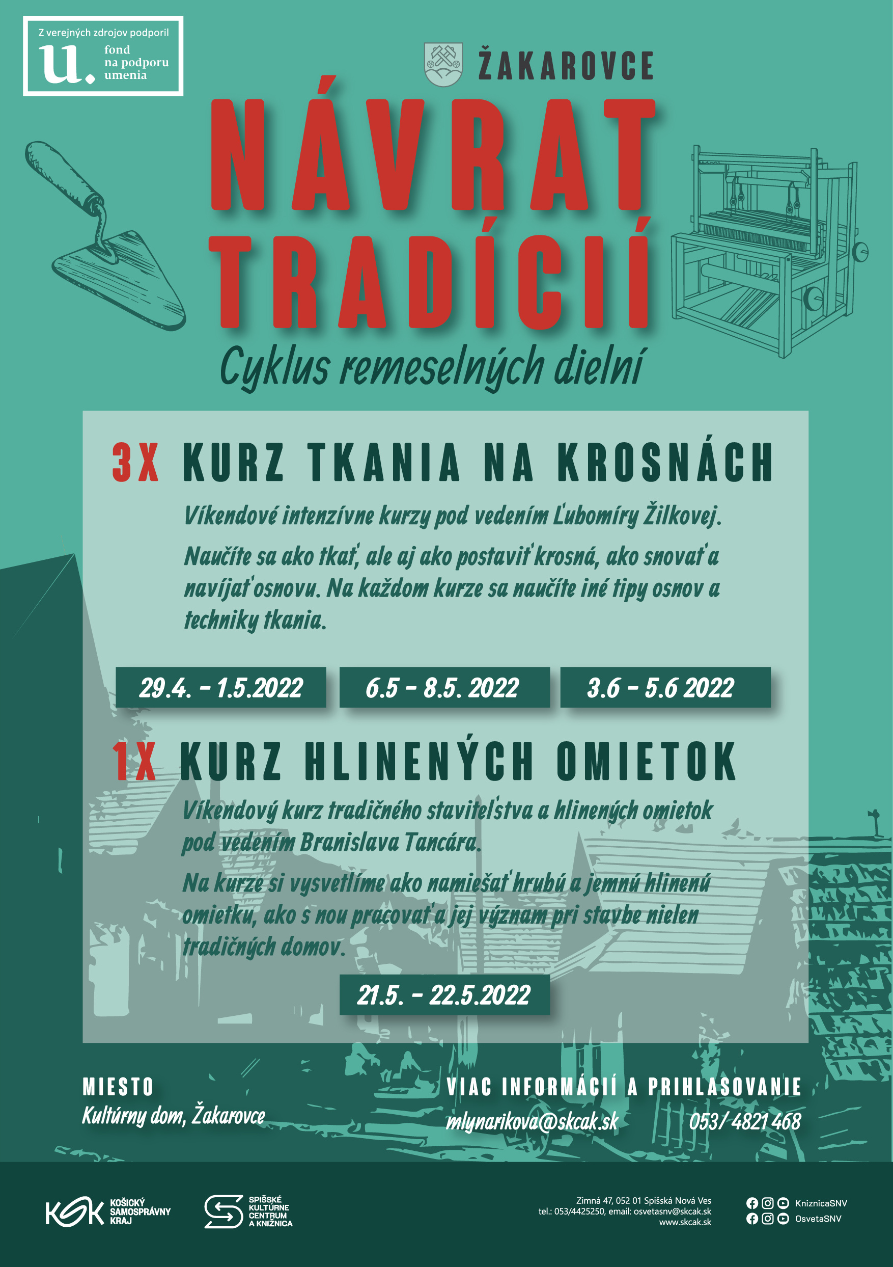 4 remeselné víkendy zamerané na návrat tkania a hlinených omietok do obce Žakarovce. TKANIE 3 víkendy budú zamerané na tkanie od úplných začiatkov, postavenia krosien, snovania a navíjania osnovy až po tkanie. Ukážeme si rôzne druhy osnov a spôsoby tkania. HLINENÉ OMIETKY Jeden víkend venujeme príprave a aplikácii hlinených omietok. Ukážeme si ako pripraviť hlinu, namiešať hrubú a jemnú omietku, aj ako ju nanášať.
