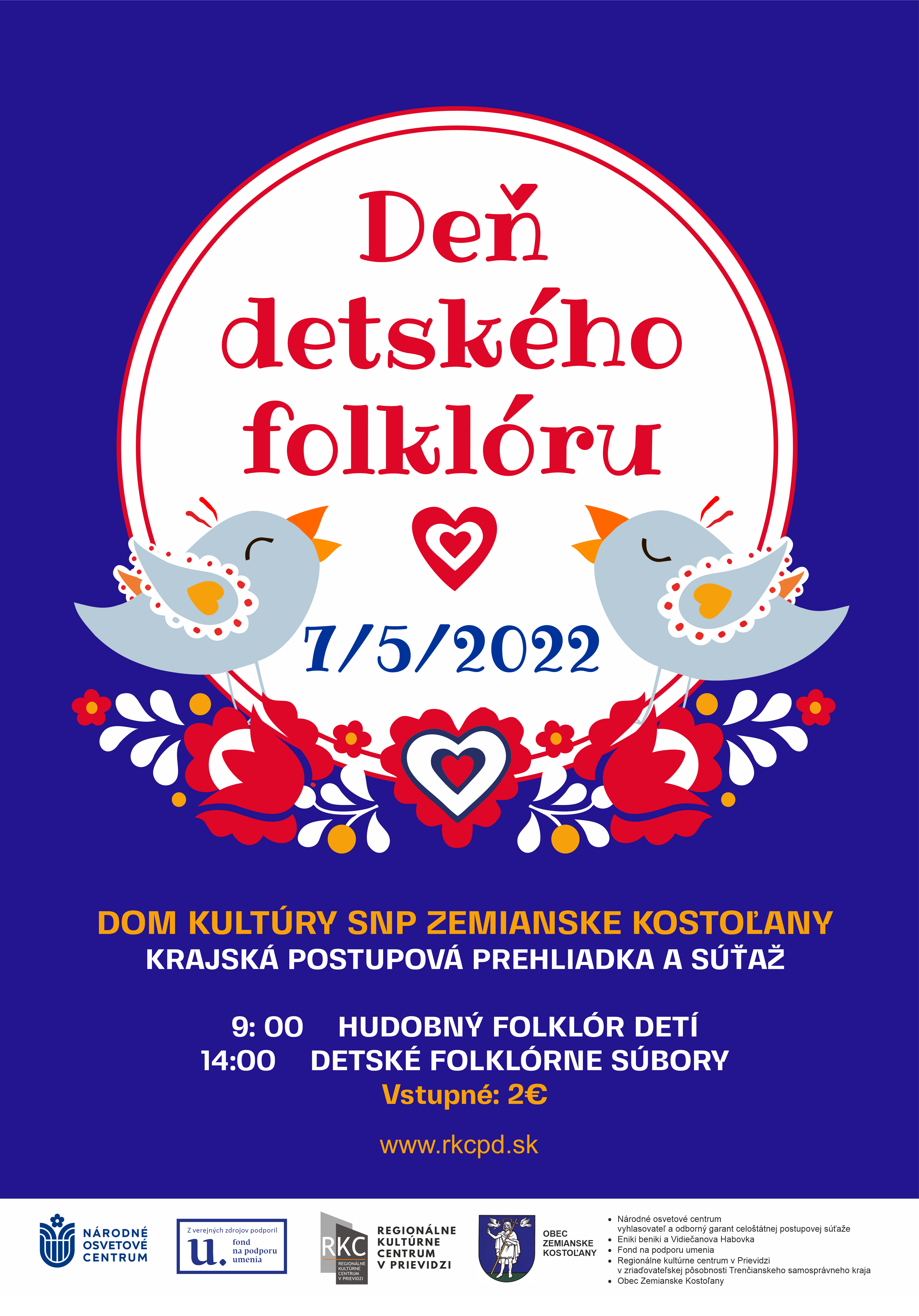 Deň detského folklóru Krajská postupová súťaž detského hudobného folklóru je krajským stupňom celoštátneho postupového systému vyhláseného NOC v Bratislave na území Trenčianskeho kraja. Z tohto územia čerpajú účinkujúci zvyky a tradície. Jej zámerom je súťaž a prehliadka detského hudobného folklóru a prezentácia vybraných detských ľudových hudieb, sólistov inštrumentalistov, sólistov spevákov a speváckych skupín, ktoré odborná porota odporučila z regionálnych kôl.