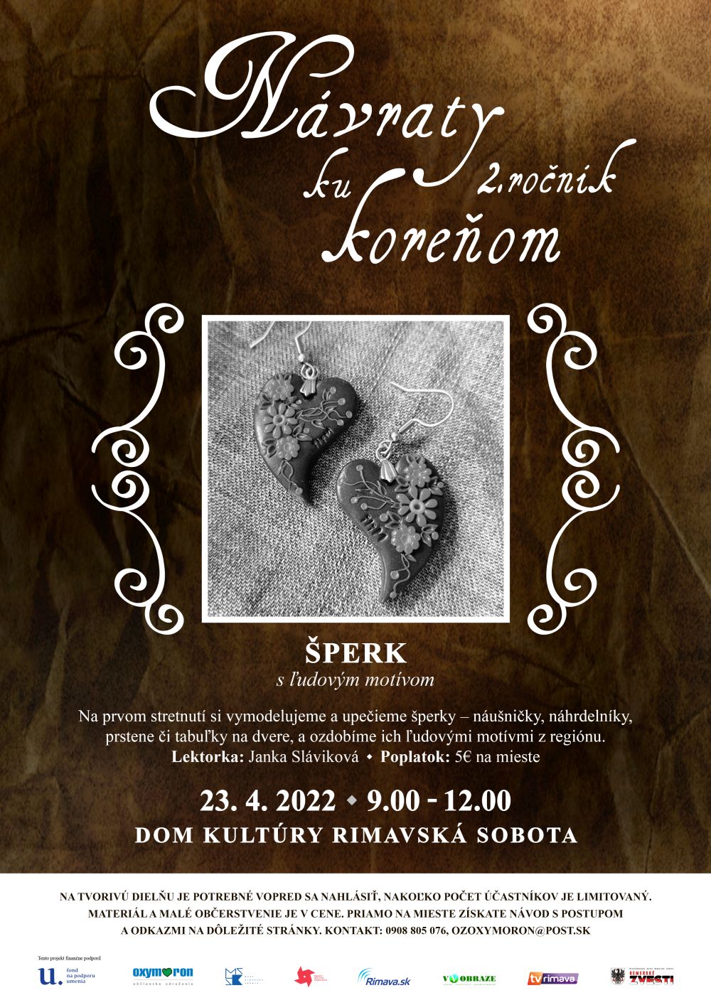 Šperk s ľudovým motívom je témou prvej tvorivej soboty v rámci druhého ročníka projektu Návraty ku koreňom. Počas siedmych stretnutí nás šikovní lektori prevedú tradičnými technikami a spolu sa vrátime do čias remesiel a ručných prác. Na prvom kurze si vymodelujeme a upečieme šperky - náušnice a náhrdelníky. Tvorivá dielňa s názvom Šperk s ľudovým motívom sa uskutoční v sobotu, 23.4. 2022, 9.00 – 12.00 hod. v Dome kultúry / vchod od fontány.
