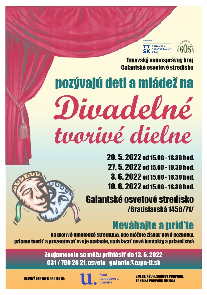 Hlavným zámerom podujatia Divadelné tvorivé dielne v rámci projektu Vzdelávacie aktivity v Galantskom regióne, je poskytnúť deťom a mládeži priestor na zmysluplné využívanie voľného času. Realizátorom Divadelných tvorivých dielní je Galantské osvetové stredisko. Divadelné dielne podporujú tvorivú činnosť detí a mládeže, iniciujú záujem o nadobúdanie nových informácií a ponúkajú rozširovanie vedomostí.