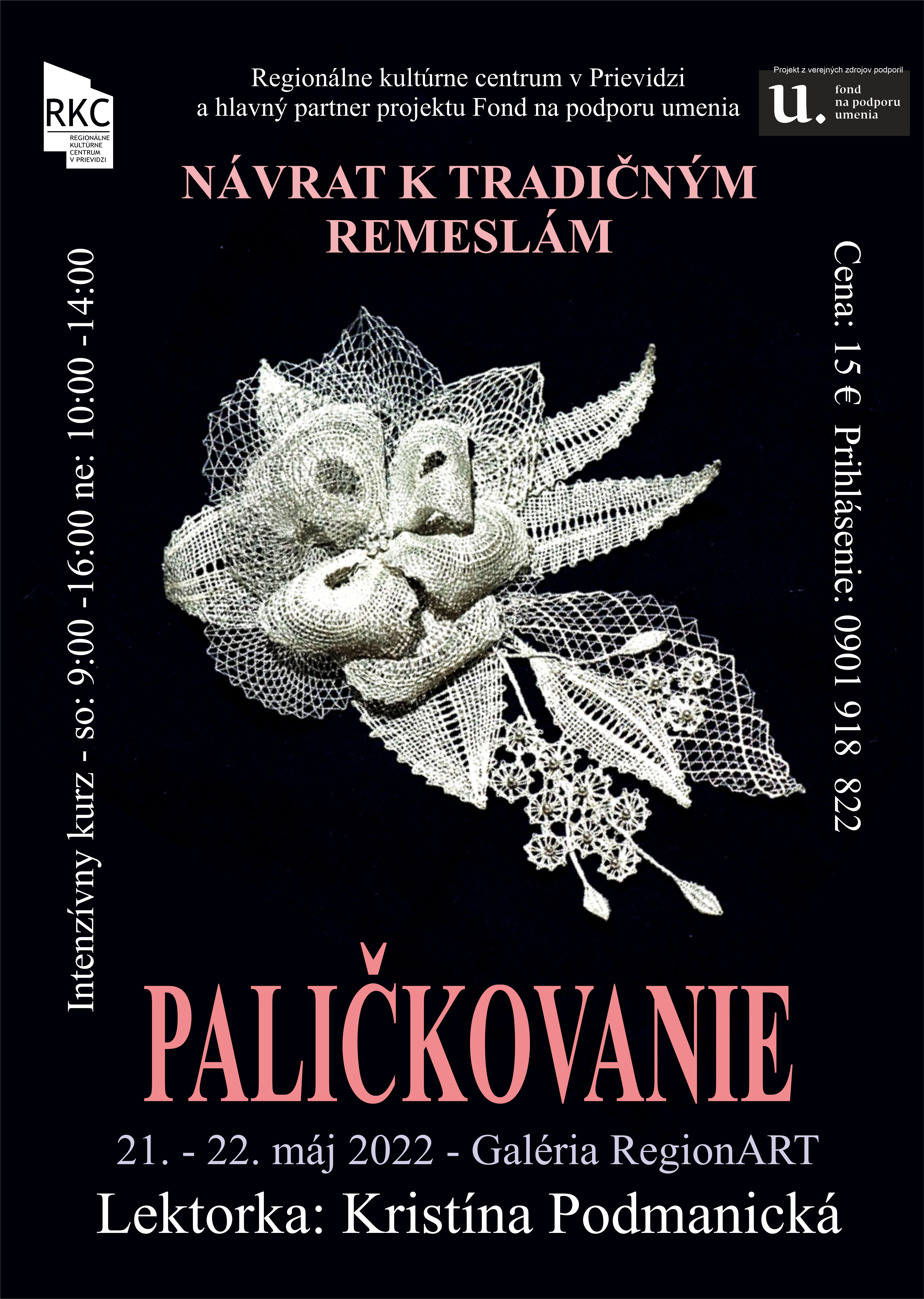 Trojdňový workshop v Trenčíne je príležitosťou na vzdelávanie odborného publika aktívne tvoriacich čipkárok/čipkárov z celého Slovenska. Poskytne priestor na ich tvorbu, rozvoj talentu, získanie nových poznatkov, vedomostí a remeselnej zručnosti v oblasti paličkovanej čipky s akcentom na nosnú tému projektu, ktorou je zachovanie tradičných regionálnych prvkov paličkovanej čipky v súčasnom kontexte.