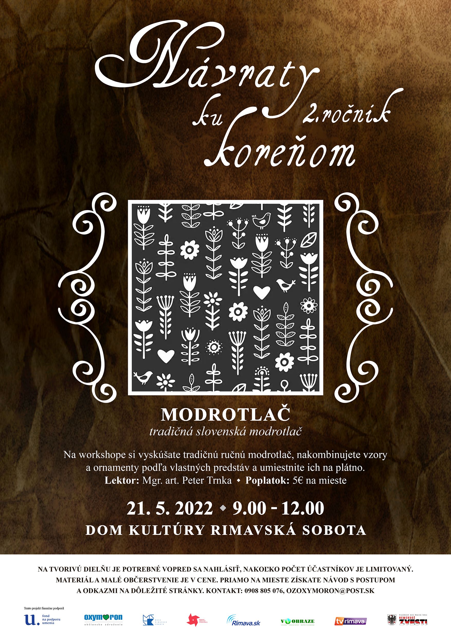 Témou druhej tvorivej dielne projektu Návraty ku koreňom 2 bude „Tradičná slovenská modrotlač“. Pod vedením lektora Mgr. art. Petra Trnku sa dozvieme o tejto technike viac a aj si ju prakticky vyskúšame v sobotu, 21. 5., v čase od 9.00 – 12.00 hod. v Dome kultúry. Poplatok 5€ / platba na mieste. Projekt z verejných zdrojov podporil Fond na podporu umenia.