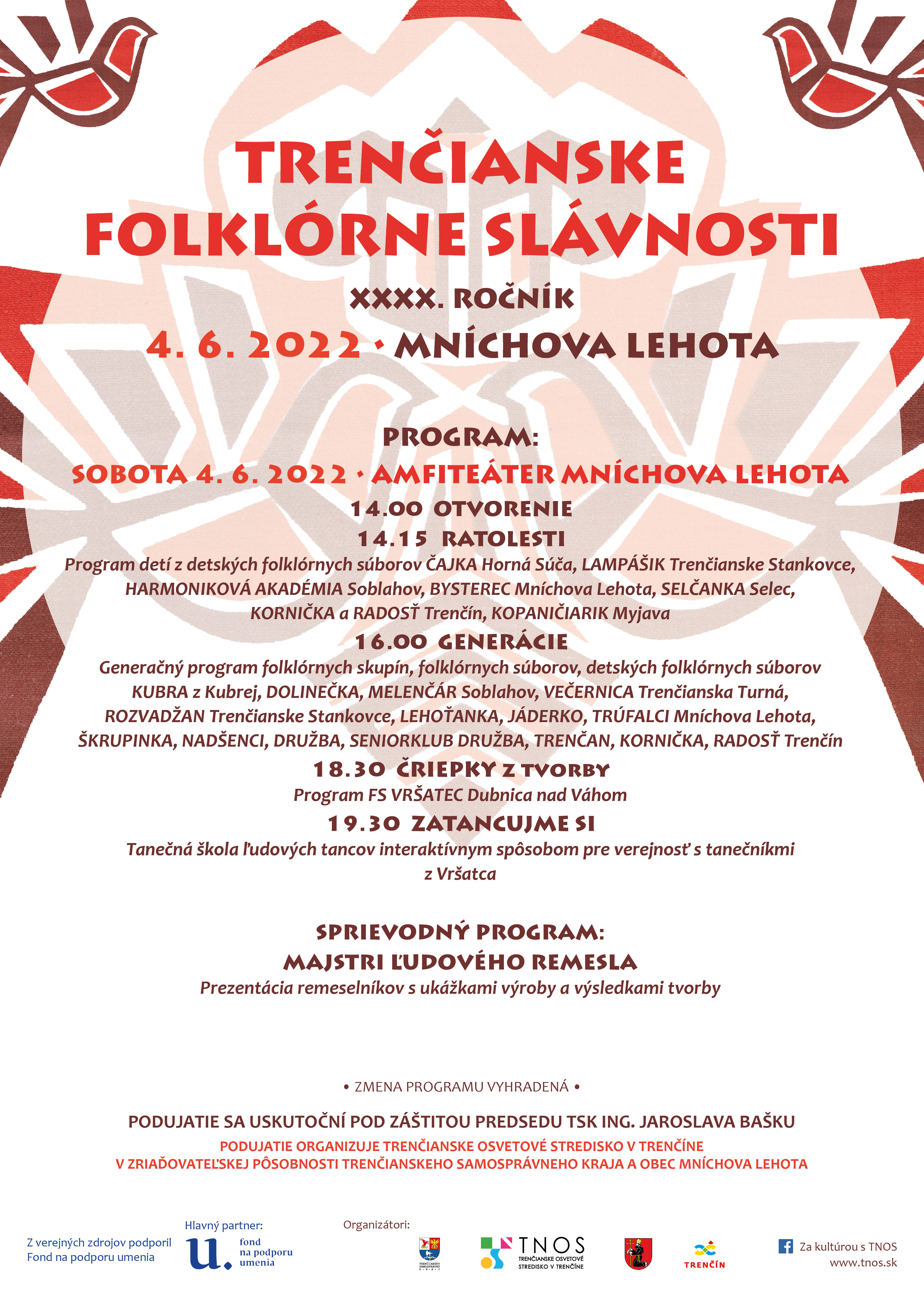 Trenčianske osvetové stredisko v Trenčíne v zriaďovateľskej pôsobnosti Trenčianskeho samosprávneho kraja a obec Mníchova Lehota Vás srdečne pozývajú na jubilejný XXXX. ročník TRENČIANSKYCH FOLKLÓRNYCH SLÁVNOSTÍ, kde sa predstavia vynikajúce folklórne súbory a skupiny. Súčasťou programu bude aj škola ľudových tancov pre verejnosť a sprievodný program MAJSTRI ĽUDOVÉHO REMESLA.
