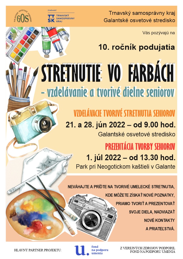 Poskytnúť priestor na vzdelávanie a prezentáciu tvorivých zručností seniorov z Galantského regiónu, využívajúcich svoj voľný čas výtvarnými aktivitami, umožňuje jubilejný 10. ročník kreatívno-edukačných podujatí pod názvom Stretnutie vo farbách. Organizátorom tvorivých dielní a verejnej prezentácie diel je Galantské osvetové stredisko. Projekt z verejných zdrojov podporil Fond na podporu umenia, ktorý je zároveň aj hlavným partnerom projektu.