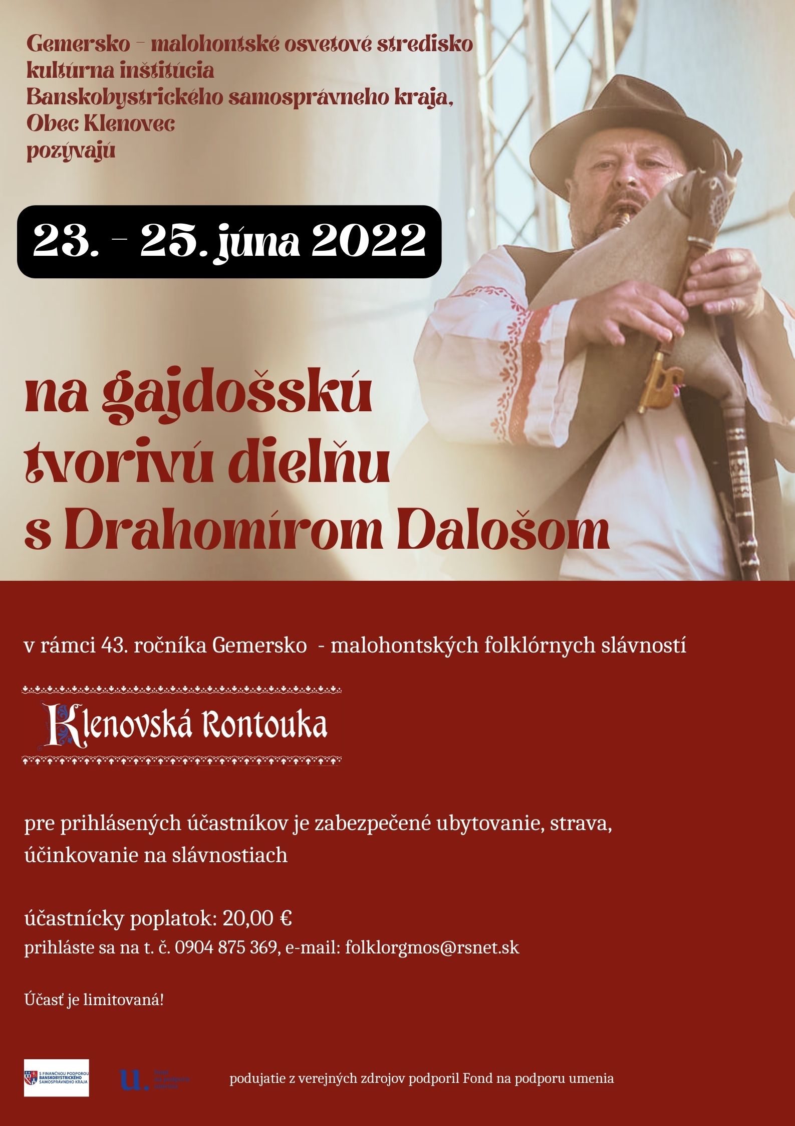 Gemersko - malohontské osvetové stredisko - kultúrna inštitúcia Banskobystrického samosprávneho kraja, Obec Klenovec, o.z. RODON Klenovec Vás pozývajú 23. – 26.6.2022 na Gemersko - malohontské folklórne slávnosti, Klenovská rontouka, 43. ročník v obci Klenovec. Festival ľudových remesiel, gastronómie, tvorivých dielní, scénických programov, výstav Vám sľubuje príjemnú folklórnu atmosféru. Podujatie z verejných zdrojov podporil Fond na podporu umenia a Banskobystrický samosprávny kraj.