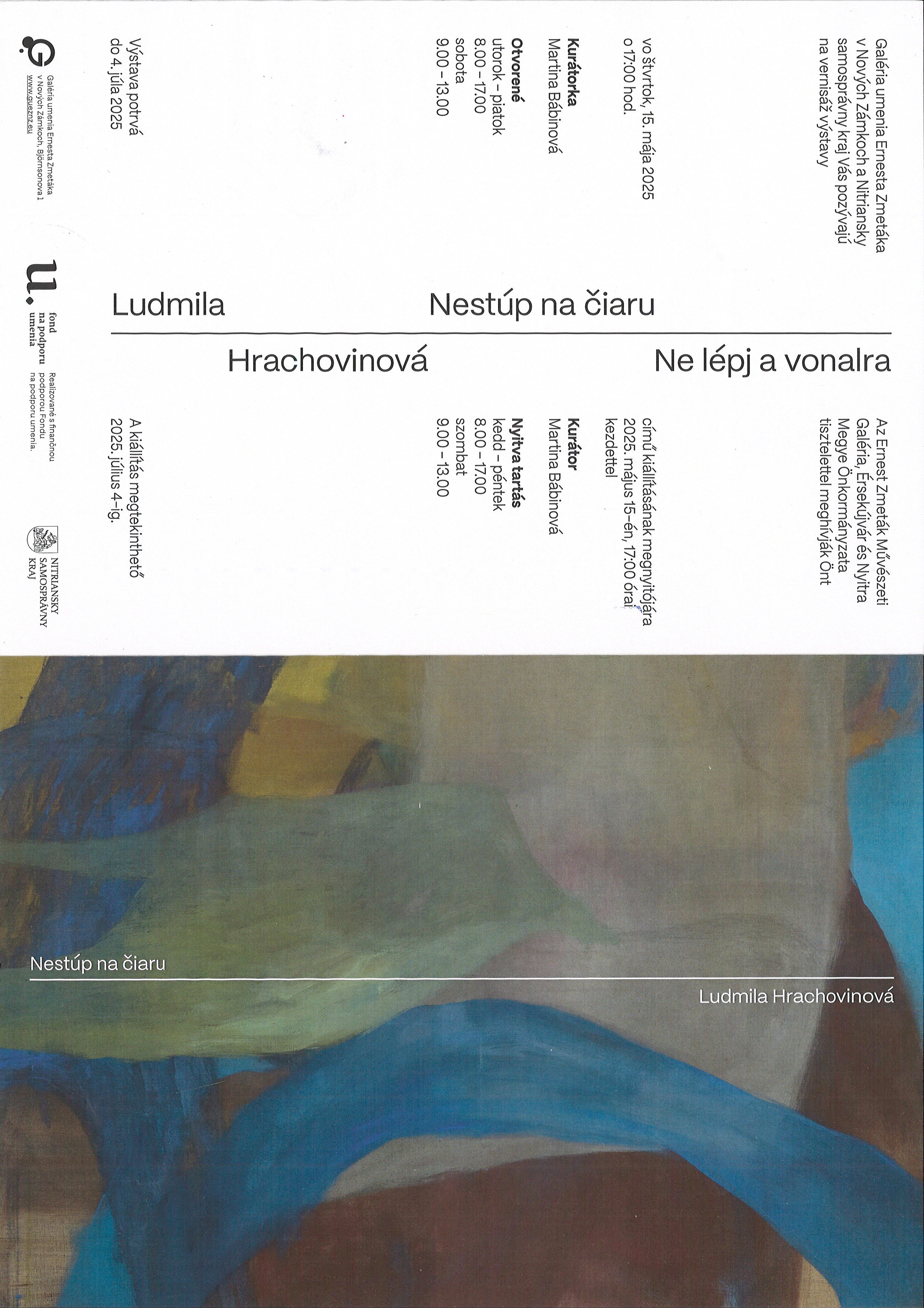 Galéria umenia Ernesta Zmetáka v Nových Zámkoch Vás srdečne pozýva na vernisáž výstavy Nestúp na čiaru výtvarníčky Ludmily Hrachovinovej. Vernisáž: 15. máj 2025 o 17:00 Miesto podujatia: Galéria umenia Ernesta Zmetáka v Nových Zámkoch, Björnsonová 1 Trvanie výstavy: 15. máj - 4. júl 2025 Kurátorka: Martina Bábinová Projekt z verejných zdrojov podporil Fond na podporu umenia.
