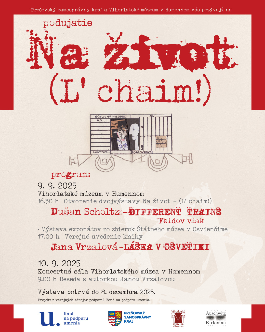 Vihorlatské múzeum v Humennom pripravuje na september 2025 podujatie Na život – L’chaim!, venované pamiatke obetí a príbehom preživších holokaustu. Program zahŕňa otvorenie dvojvýstavy diel Dušana Scholtza a exponátov zo Štátneho múzea v Osvienčime, uvedenie knihy Jany Vrzalovej Láska v Osvětimi so scénickým spracovaním a besedu s autorkou pre študentov. Podujatie nesie silné historické a spoločenské posolstvo.