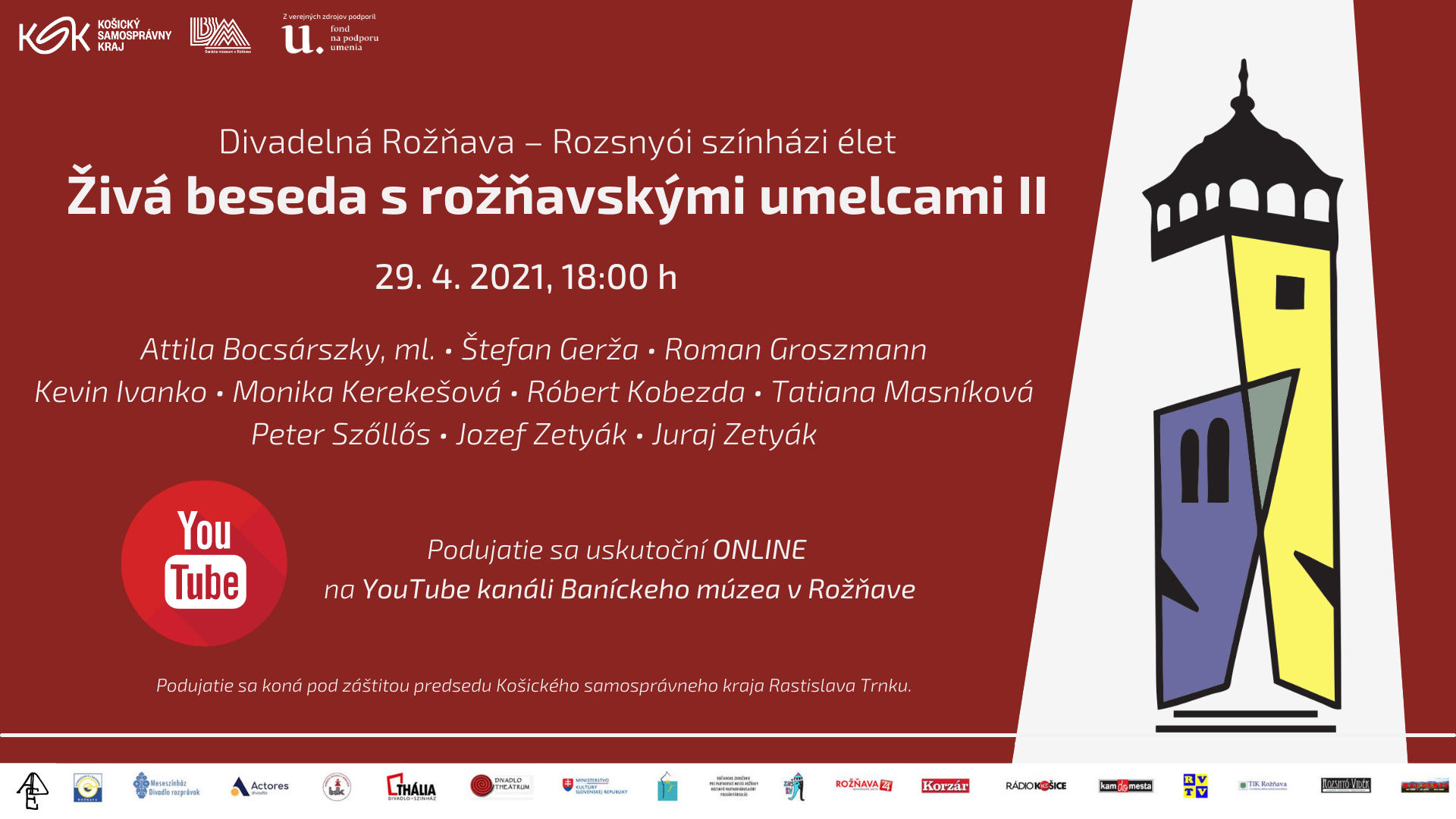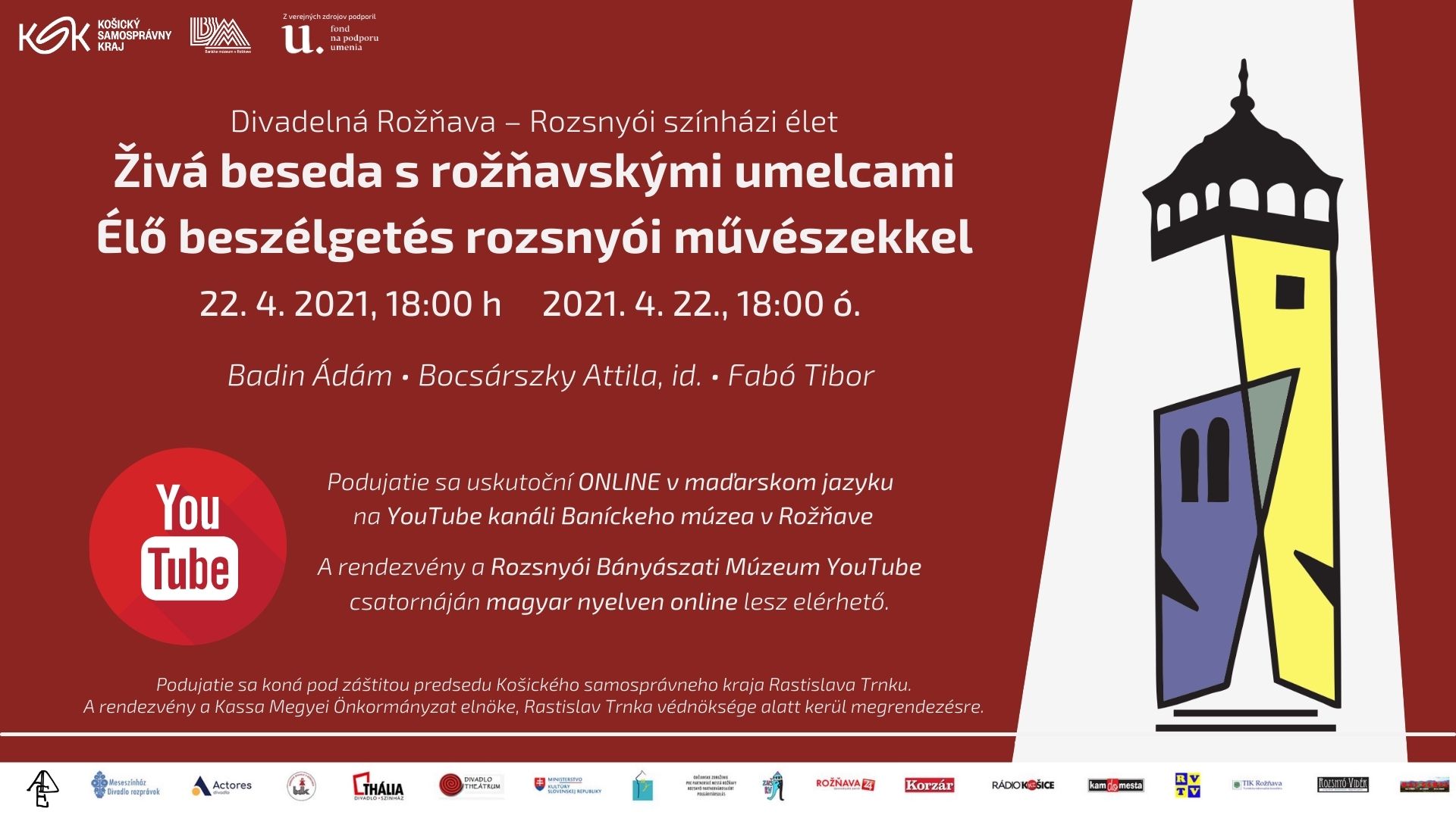 Banícke múzeum v Rožňave, pripravilo pre záujemcov živú besedu s umelcami, ktorá sa uskutoční v online priestore 22. 4. 2021 o 18:00 hod.. Na besede sa porozprávame s Ádámom Badinom – umeleckým vedúcim Divadla Rozprávok – Meseszínház, Attilom Bocsárszkym – vedúcim hereckého súboru Divadla Thália Színház v Košiciach a Tiborom Fabóom – laureátom umeleckej ceny Jászai, hercom Jókaiho Divadla v Komárne. Pre spojenie na živé vysielanie kliknite sem: https://youtu.be/SVvYhVbxBCE