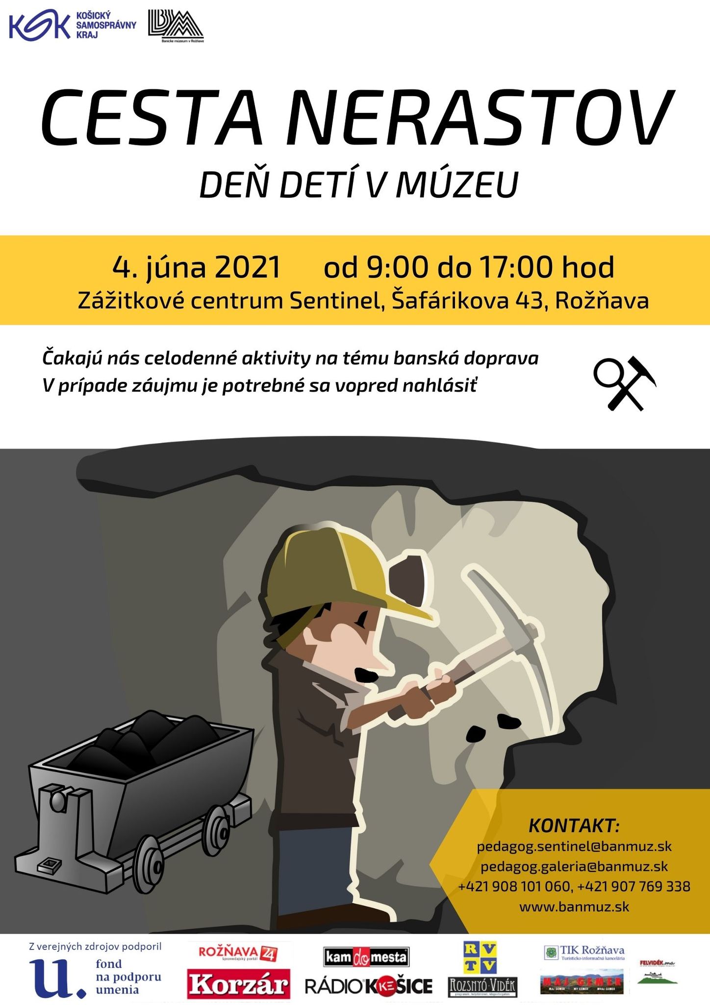 Deň detí v Baníckom múzeu v Rožňave Termín: 4. 6. 2021 od 9:00 do 17:00 Program: - prezentácia jednotlivých druhov banskej dopravy, s možnosťou niektorých aj obsluhovať - vyskúšanie najnovšieho interaktívneho prvku v areáli múzea – jazda banským vláčikom do štôlne Alexander - interaktívne hry - komentované prehliadky Aktivity sú určené najmenším návštevníkom múzea, hlavne deťom z MŠ a 1. stupňa ZŠ. Záujem zúčastniť sa na podujatí je potrebné nahlásiť vopred, počet účastníkov je limitova