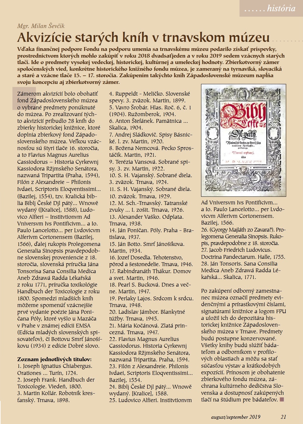 Prezentácia zakúpených kníh v článku Akvizície starých kníh v trnavskom múzeu (publikovaný v periodiku Novinky z radnice, august / september 2019).