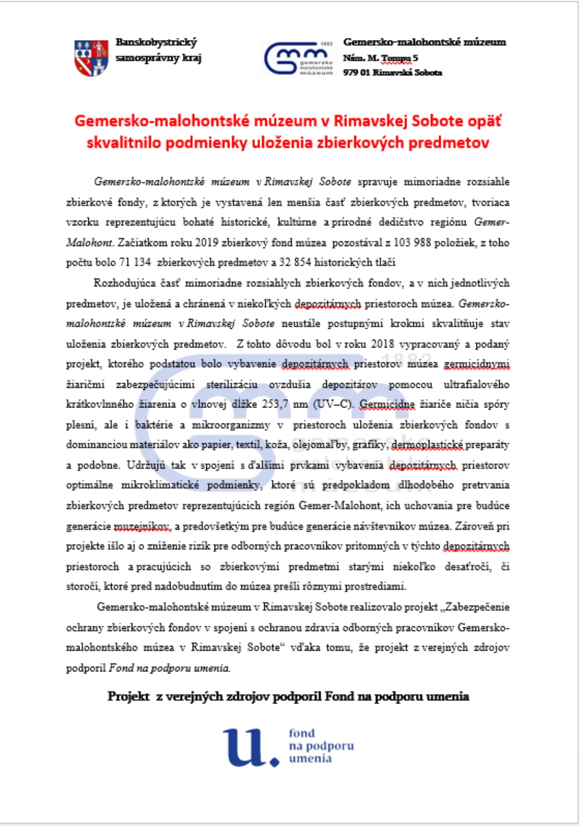 Zabezpečenie ochrany zbierkových fondov v spojení s ochranou zdravia odborných pracovníkov Gemersko-malohontského múzea v Rimavskej Sobote