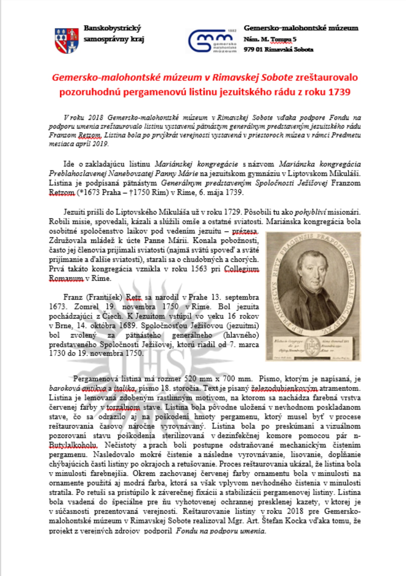 Informačný leták "Reštaurovanie unikátnej pergamenovej listiny z roku 1739 vydanej pätnástym najvyšším predstaveným Jezuitského rádu". Informačný leták prostredníctvom textu a fotografií informuje o realizácii projektu a jeho podpore z verejných zdrojov Fondom na podporu umenia. Informačný leták je obojstranne tlačený formát A5. Informačné letáky budú prístupné verejnosti vo vstupnom priestore múzea. Návštevníci, resp. zástupcovia médií, si ich môžu vziať.