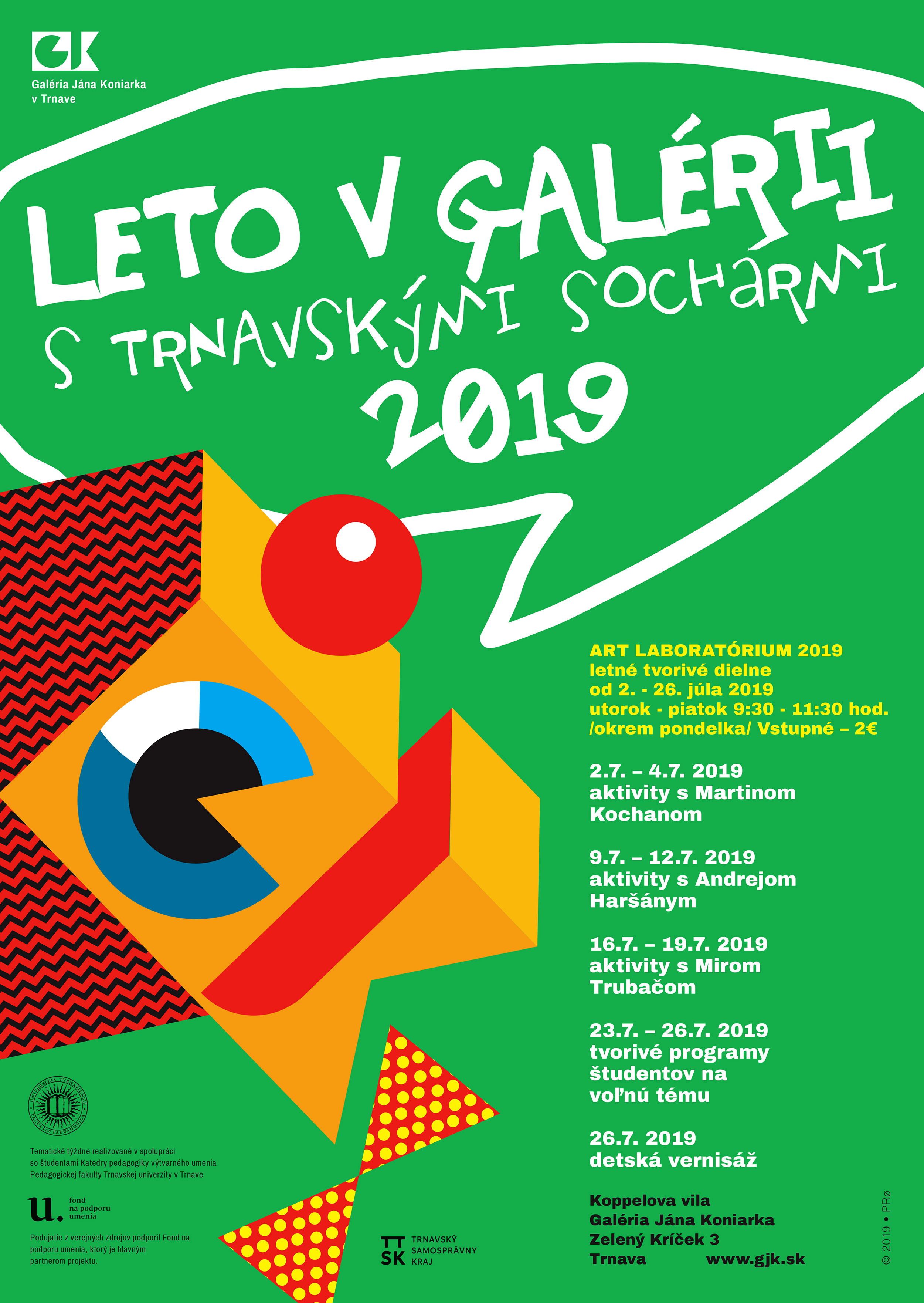 výtvarné aktivity a animačné hry pre prázdninujúce deti - júl 2019 Miesto konania: Galéria Jána Koniarka v Trnave, Koppelova vila, Zelený kríček 3 Termín konania: 2.7.2019 – 26.7.2019 Galéria Jána Koniarka v Trnave pripravila v rámci celoročného projektu ART LABORATÓRIUM 2019 program pre prázdninujúce deti a mládež pod názvom Leto v galérii 2019.