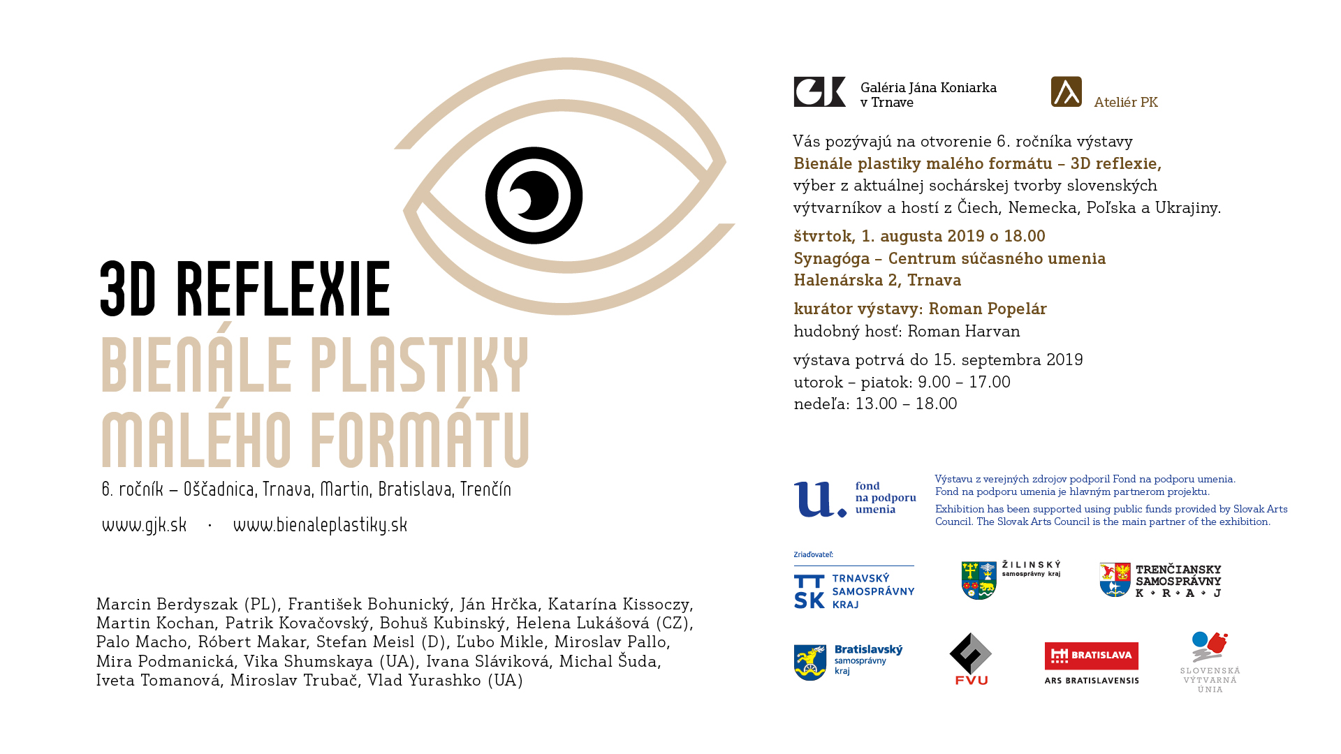 Medzinárodná výstava sochárskej tvorby zameraná na drobnú plastiku, objekt a reliéf. Vystavujúci autori: Marcin Berdyszak (PL), František Bohunický, Ján Hrčka, Katarína Kissoczy, Martin Kochan, Patrik Kovačovský, Bohuš Kubinský, Helena Lukášová (CZ), Palo Macho, Róbert Makar, Stefan Meisl (D), Ľubo Mikle, Miroslav Pallo, Mira Podmanická, Vika Shumskaya (UKR), Ivana Sláviková, Michal Šuda, Iveta Tomanová, Miroslav Trubač, Vlad Yurashko (UKR) Vernisáž: 1.8. 2019 (Št) o 18.00 hod.