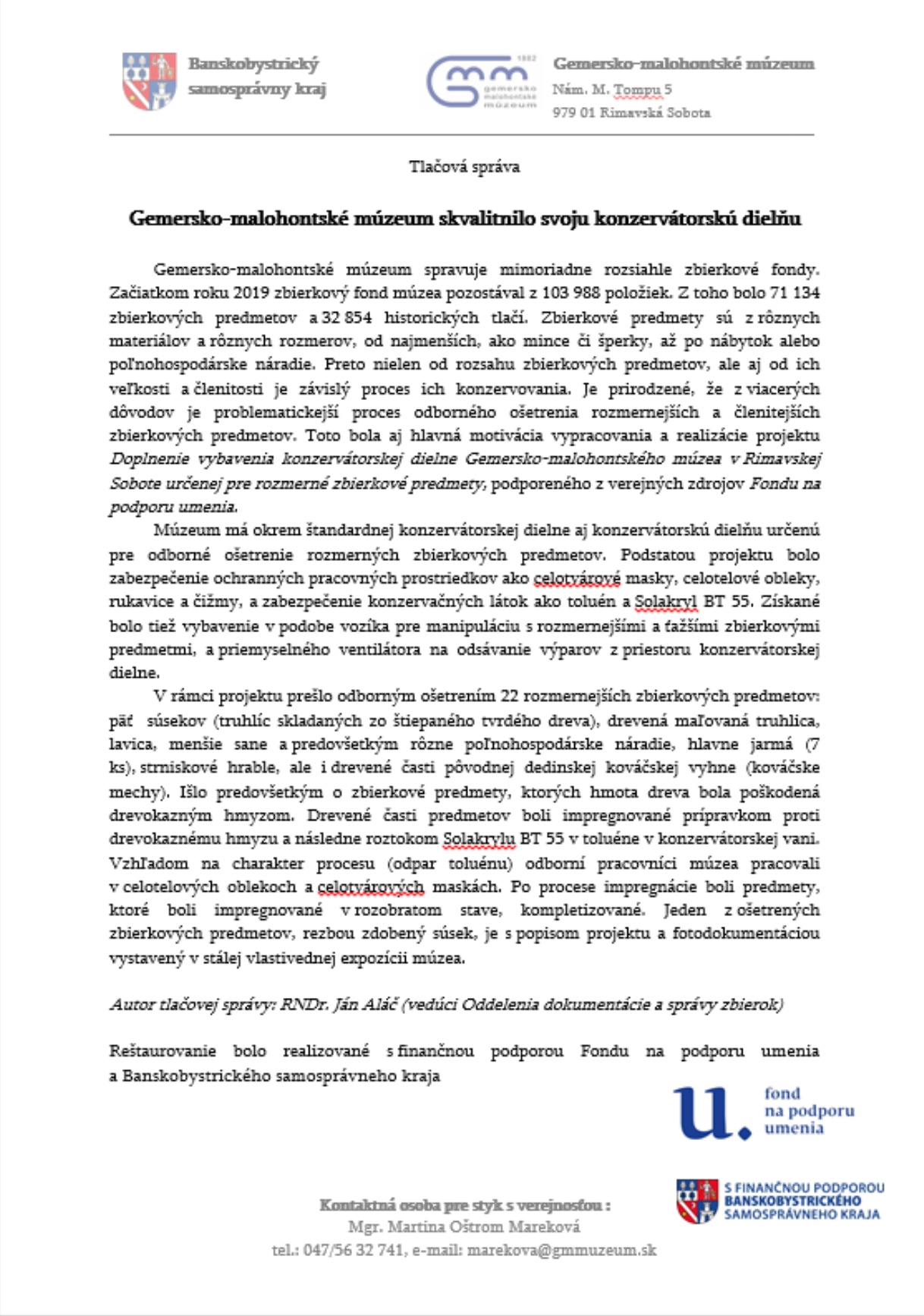Tlačová správa "Gemersko-malohontské múzeum v Rimavskej Sobote skvalitnilo svoju konzervátorskú dielňu" s trojicou priložených fotografií informujúca z priebehu realizácie projektu. Tlačová správa informuje o realizácii projektu a o jeho podpore z verejných zdrojov Fondu na podporu umenia.