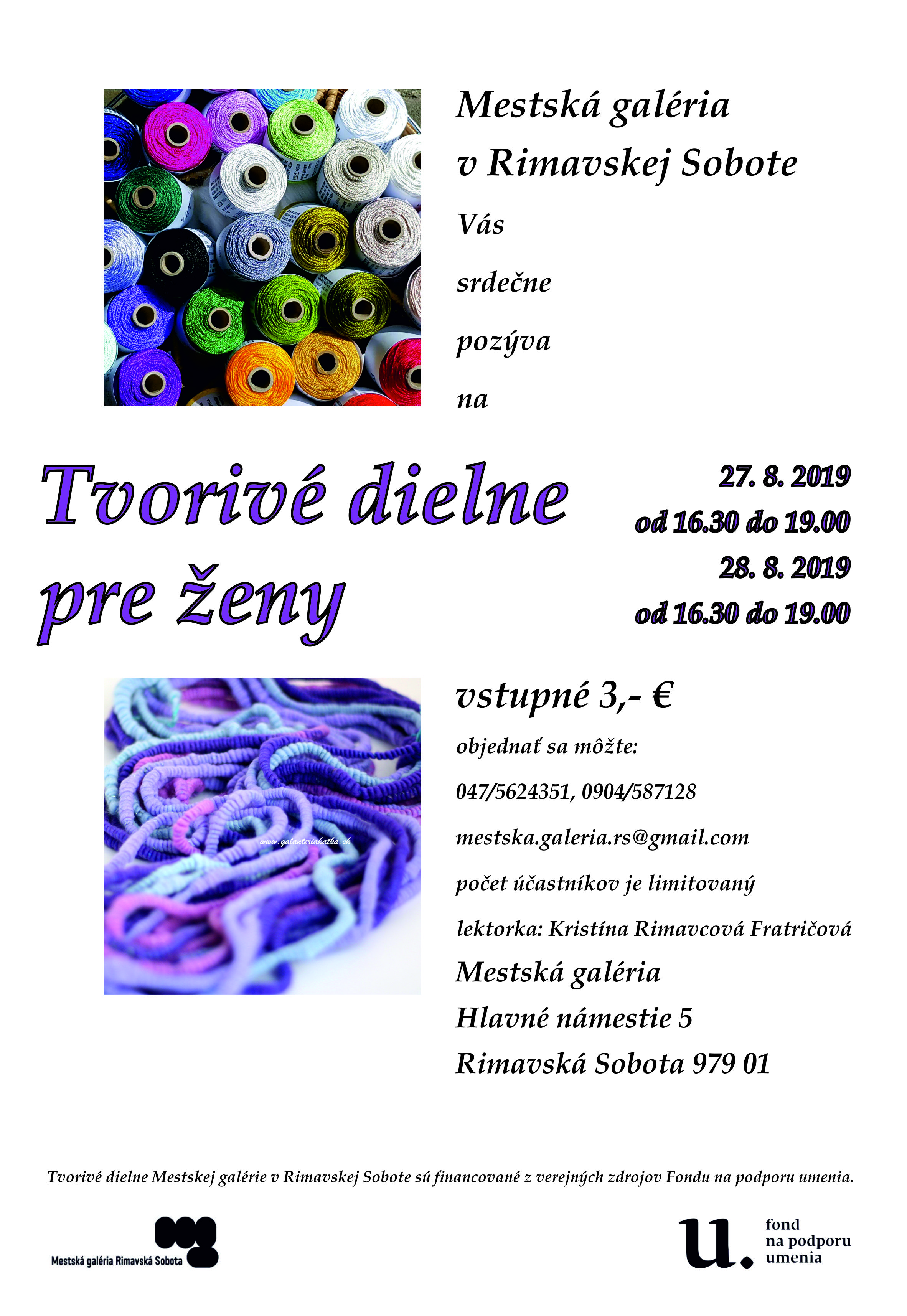 Mestská galéria v Rimavskej Sobote Vás srdečne pozýva na Tvorivé dielne pre ženy. Témou tvorivých dielní bude výšivka ľudová aj súčasná. V prvom dni sa budeme venovať ľudovej výšivke, jej prepojeniu so súčasnosťou s využitím v ručných prácach a vyskúšame si jednotlivé výšivky aj v praxi. V druhom dni dielní si navrhneme vlastný motív na dekoratívnu tašku a zrealizujeme ho. Použijeme vyskúšané stehy z predošlého dňa.