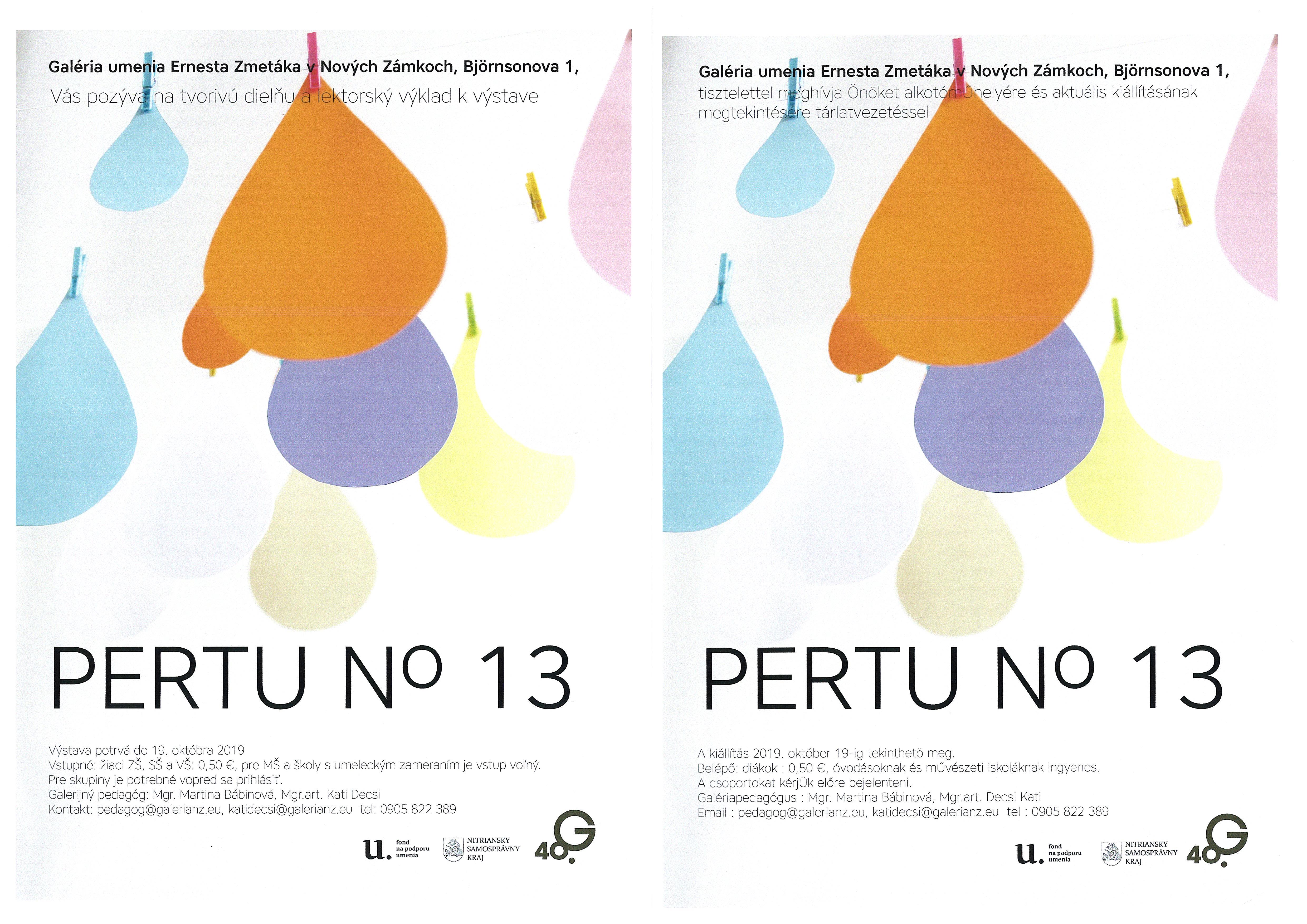 Galéria umenia Ernesta Zmetáka v Nových Zámkoch Vás pozýva na tvorivú dielňu a lektorský výklad k výstave PERTU No 13. Výstava potrvá do 19. októbra 2019. Vstupné: žiaci ZŠ, SŠ a VŠ: 0,50 €, pre MŠ a školy s umeleckým zameraním je vstup voľný.