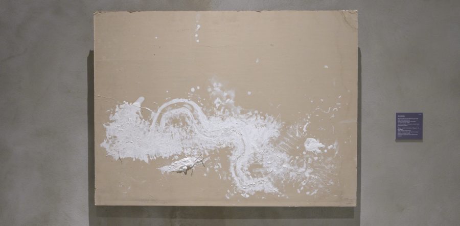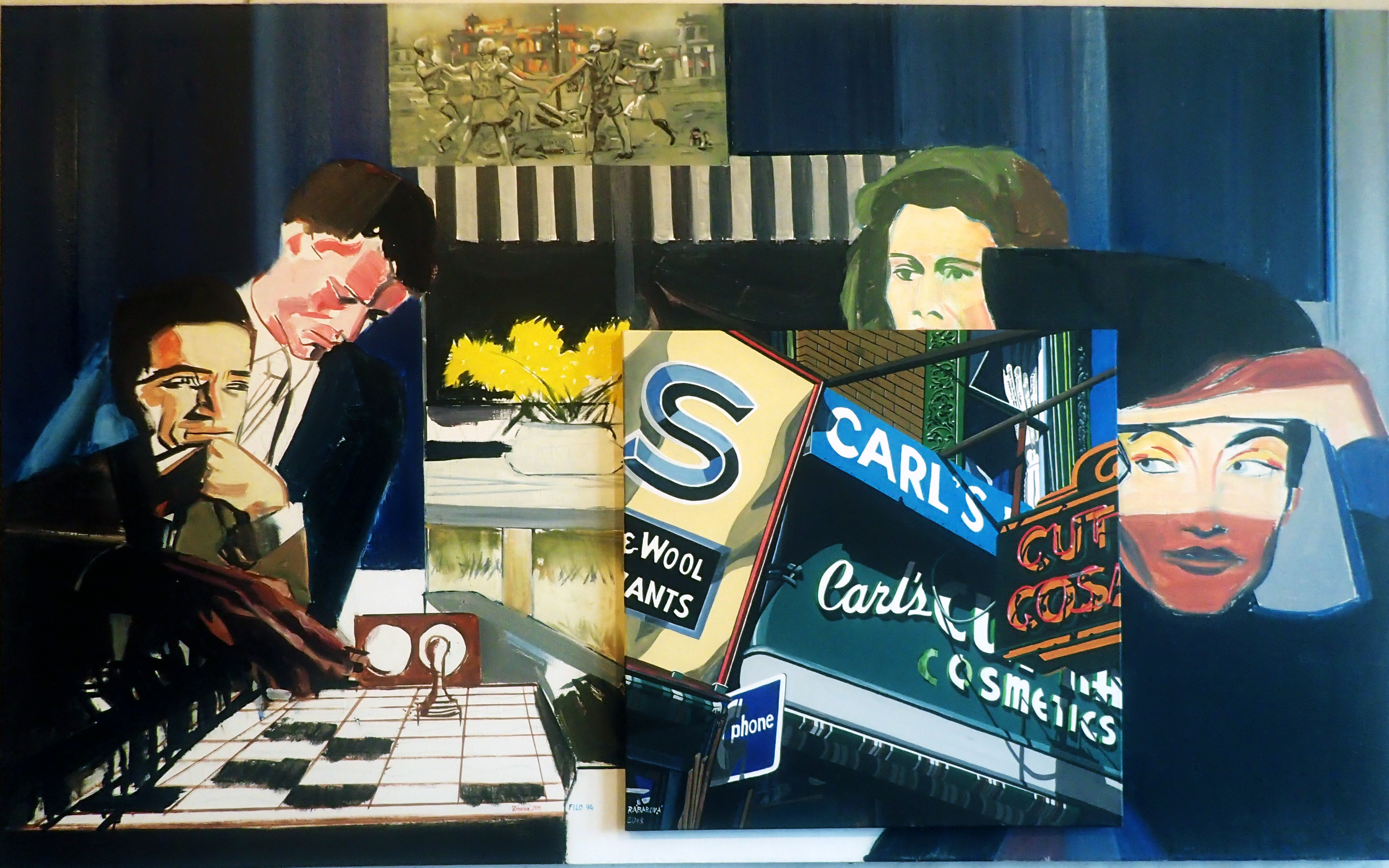 Veronika Rónaiová: Archív ako križovatka medzi minulosťou a prítomnosťou, 2019, zásahy olejom do nájdeného umeleckého diela Juliana Filu - Agresia reklamy, 1994, olej na plátne, 105 x 170 cm, do ktorého je vsadená interpretácia študentky TU Pdf. P. Rabárovej, olej na plátne, 60 x 60 cm