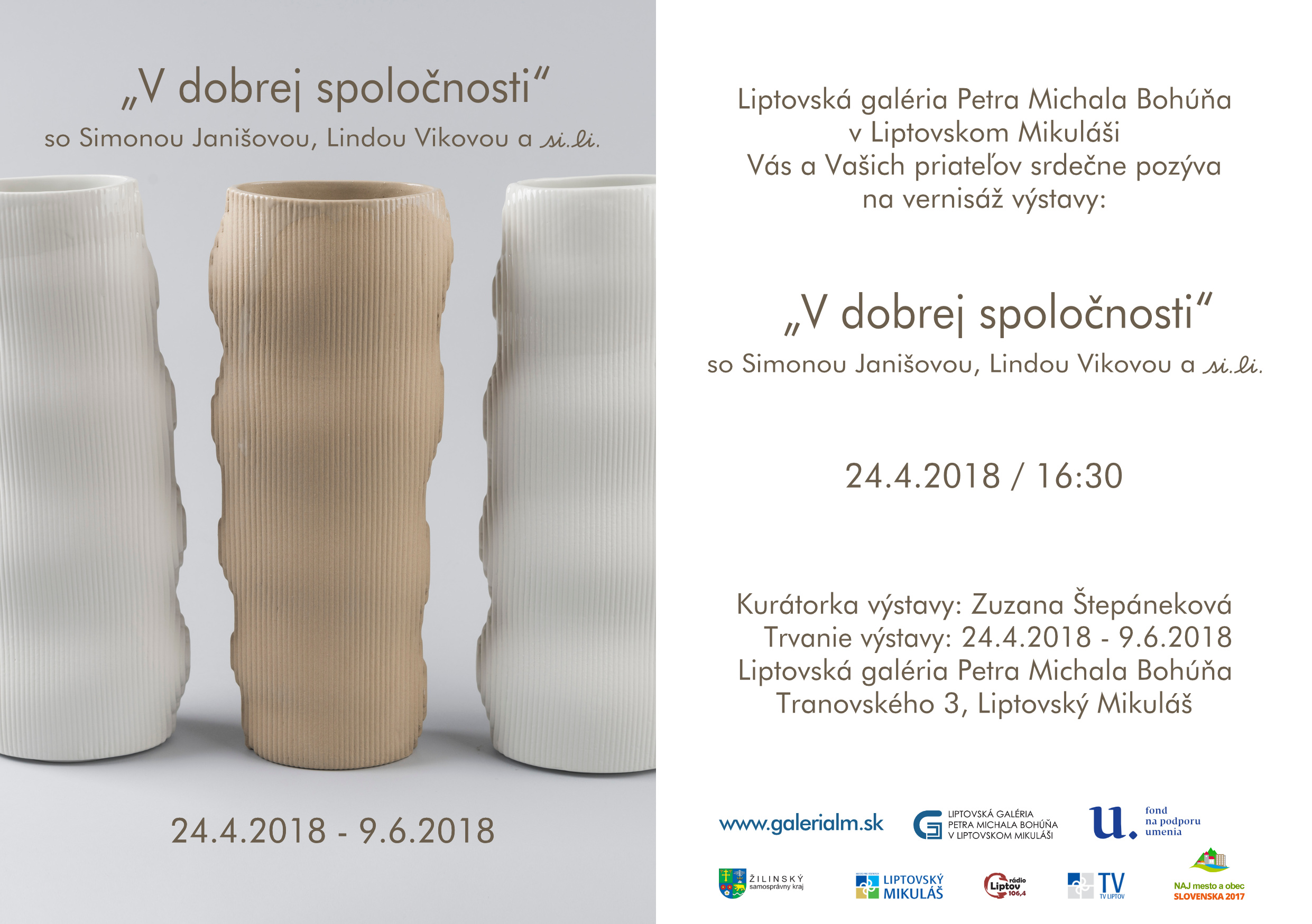 Liptovská galéria predstaví tvorbu dvoch keramikárok Simony Janišovej a Lindy Vikovej, ktoré svoje nápady realizujú spolu aj osobitne. Ich spoločnému ateliéru panuje tvorivá energia kladúca na piedestál funkčnosť a estetickú lahodnosť úžitkovej keramiky. Výstava „V dobrej spoločnosti“ ponúka prierez ich tvorbou a názormi pretavených do vecí každodenných a výnimočných svojím absolútnym prevedením a zmyslom pre detail.
