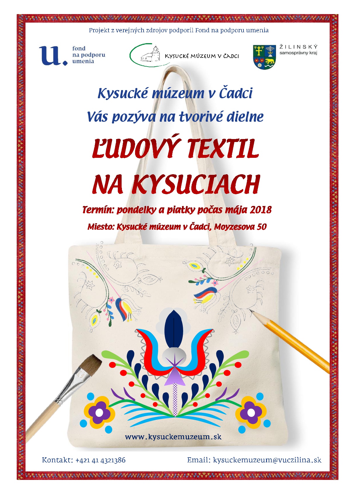 Kysucké múzeum v Čadci pozýva všetky deti a študentov na tvorivé dielne Ľudový textil na Kysuciach, ktoré sa budú konať každý pondelok (8.00-15.00) a piatok (8.00-12.00) počas mája 2018. Projekt z verejných zdrojov podporil Fond na podporu umenia.
