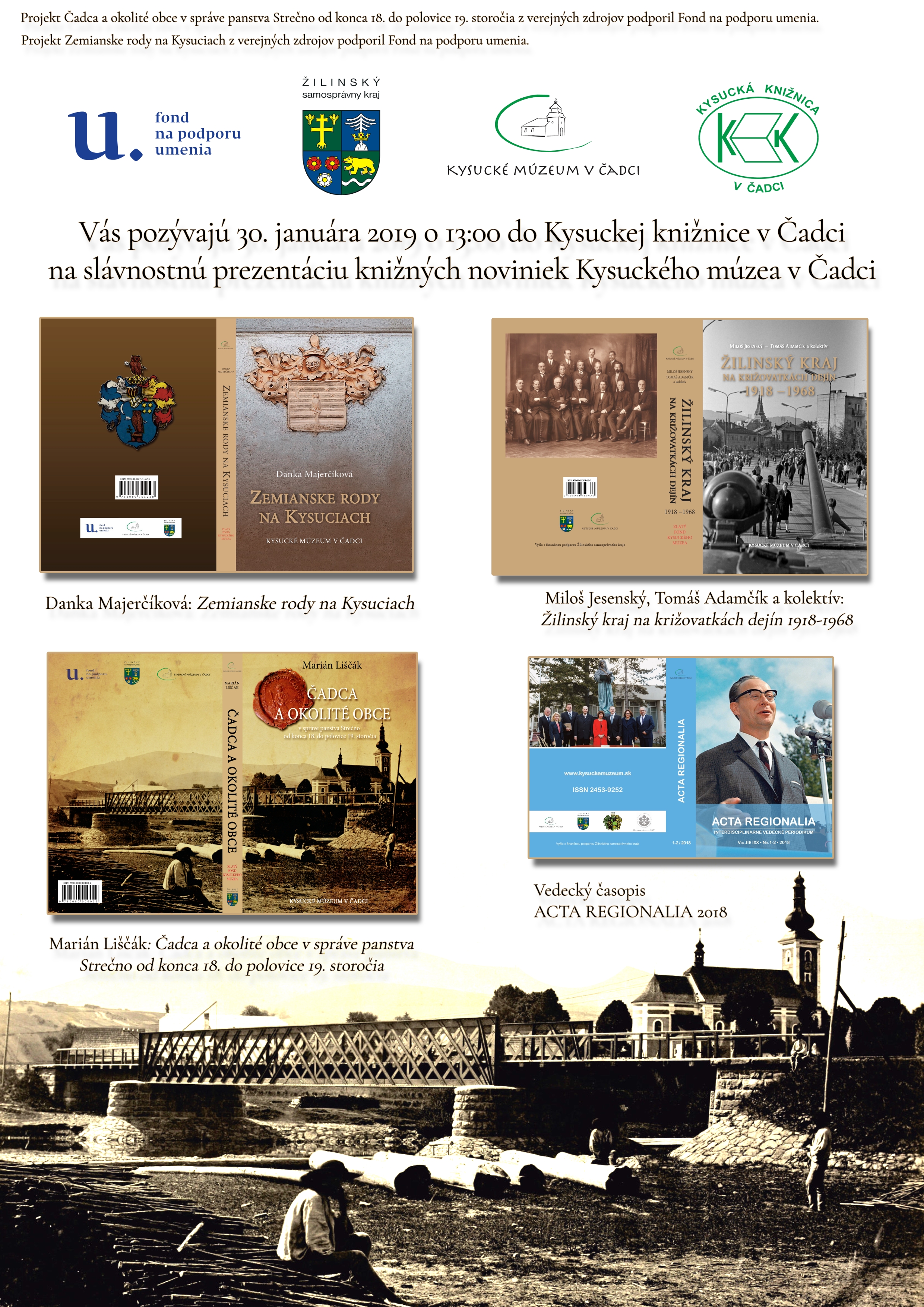 Kysucké múzeum v Čadci v spolupráci s Kysuckou knižnicou v Čadci Vás pozýva na slávnostnú prezentáciu knižných noviniek Kysuckého múzea. Prezentácia a uvedenie publikácií podporených z verejných zdrojov Fondom na podporu umenia sa uskutoční dňa 30. januára 2019 v priestoroch Kysuckej knižnice o 13. hodine.