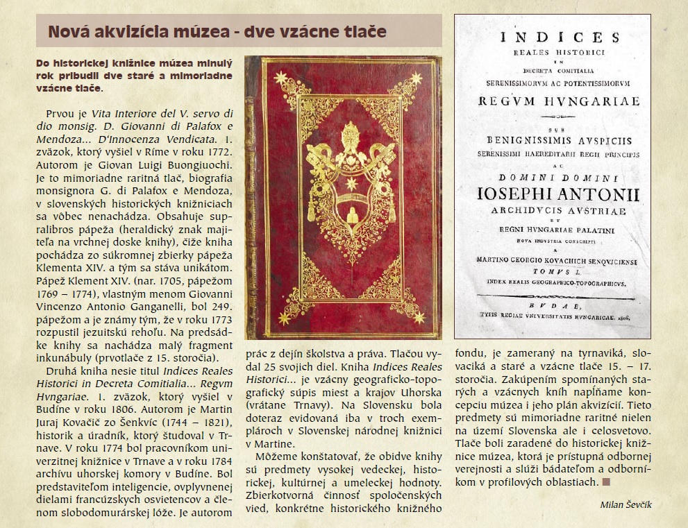 Akvizícia zbierkových predmetov - dvoch starých a vzácnych tlačí