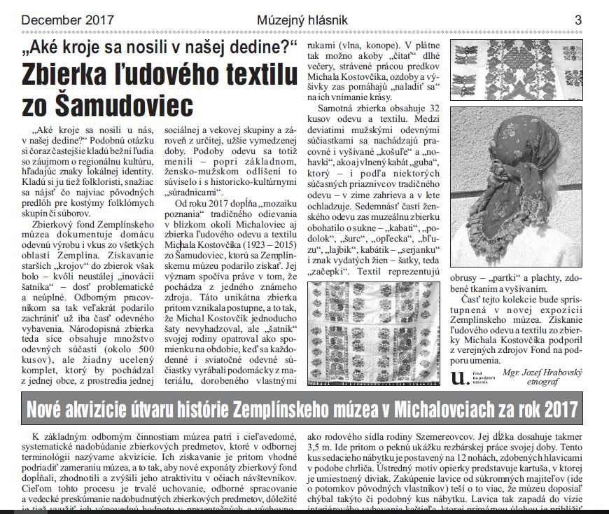 Zbierka ľudového odevu a textilu M.Kostovčíka - akvizícia