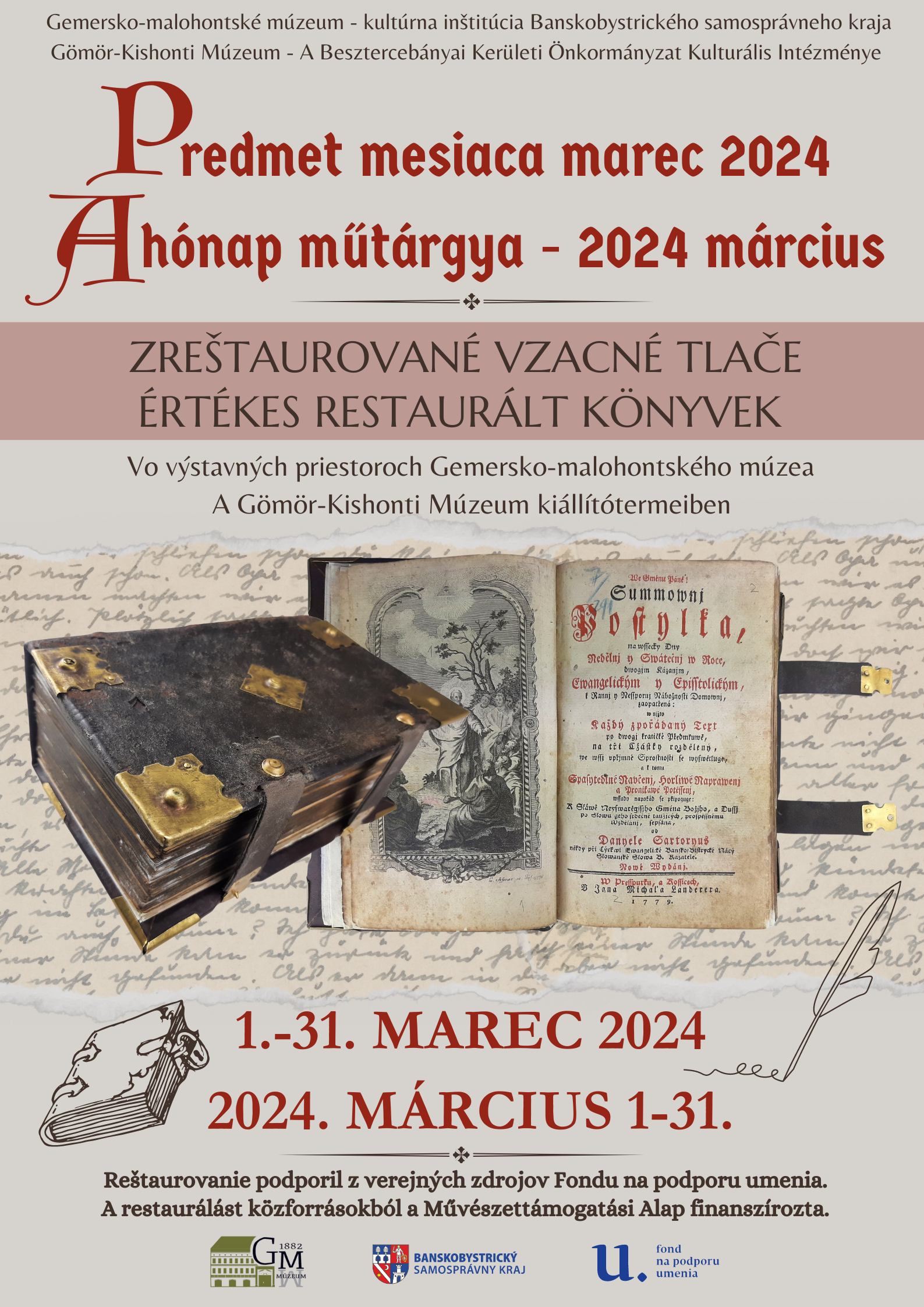 Komplexné odborné reštaurovanie 5 poškodených vzácnych tlačí 17.-19. storočia z fondu múzea, ktoré identifikujú prírastkové čísla: 267 GM, 1070 GM, 1315 GM, 2454 GM, 2463 GM. Reštaurovanie zrealizoval reštaurátor Mgr.Art. Štefan Kocka v období od 08.06.2023 do 29.02.2024. Následne od 01.03.2024 do 31.03.2024 sú zreštaurované tlače krátkodobo vystavené v expozícii múzea.