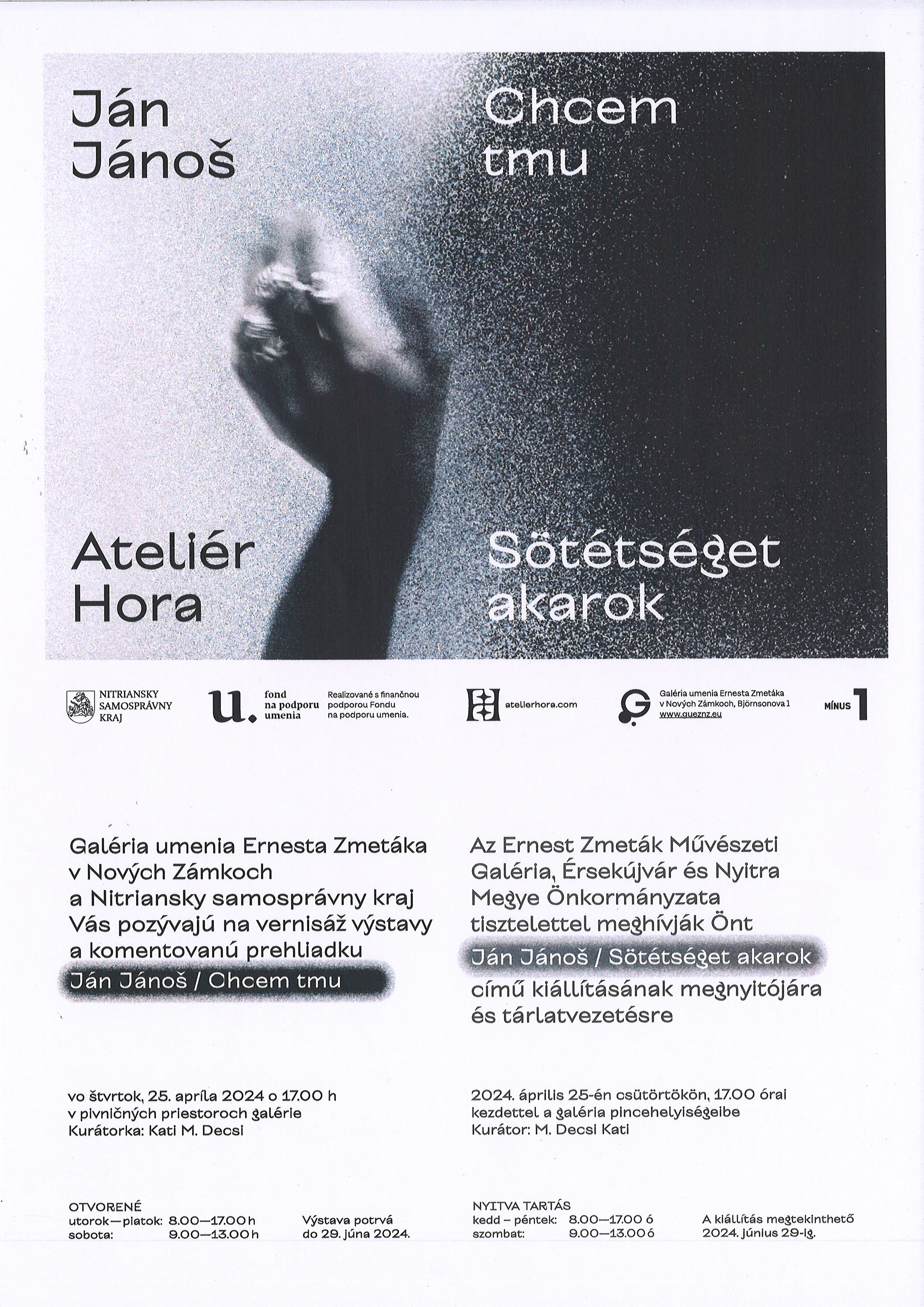 Výstava projektu Jána Jánoša bude realizovaná ako súčasť 4. ročníka PROJEKTU-1 v suteréne Galérie umenia Ernesta Zmetáka v Nových Zámkoch / Ernest Zmeták Művészeti Galéria, Érsekújvár. Názov výstavy: Ján Jánoš / Chcem tmu Otvorenie výstavy: 25. apríla 2024 o 17,00 h. Kurátorka výstavy: Kati M.Decsi Výstava potrvá do 29. júna 2024.