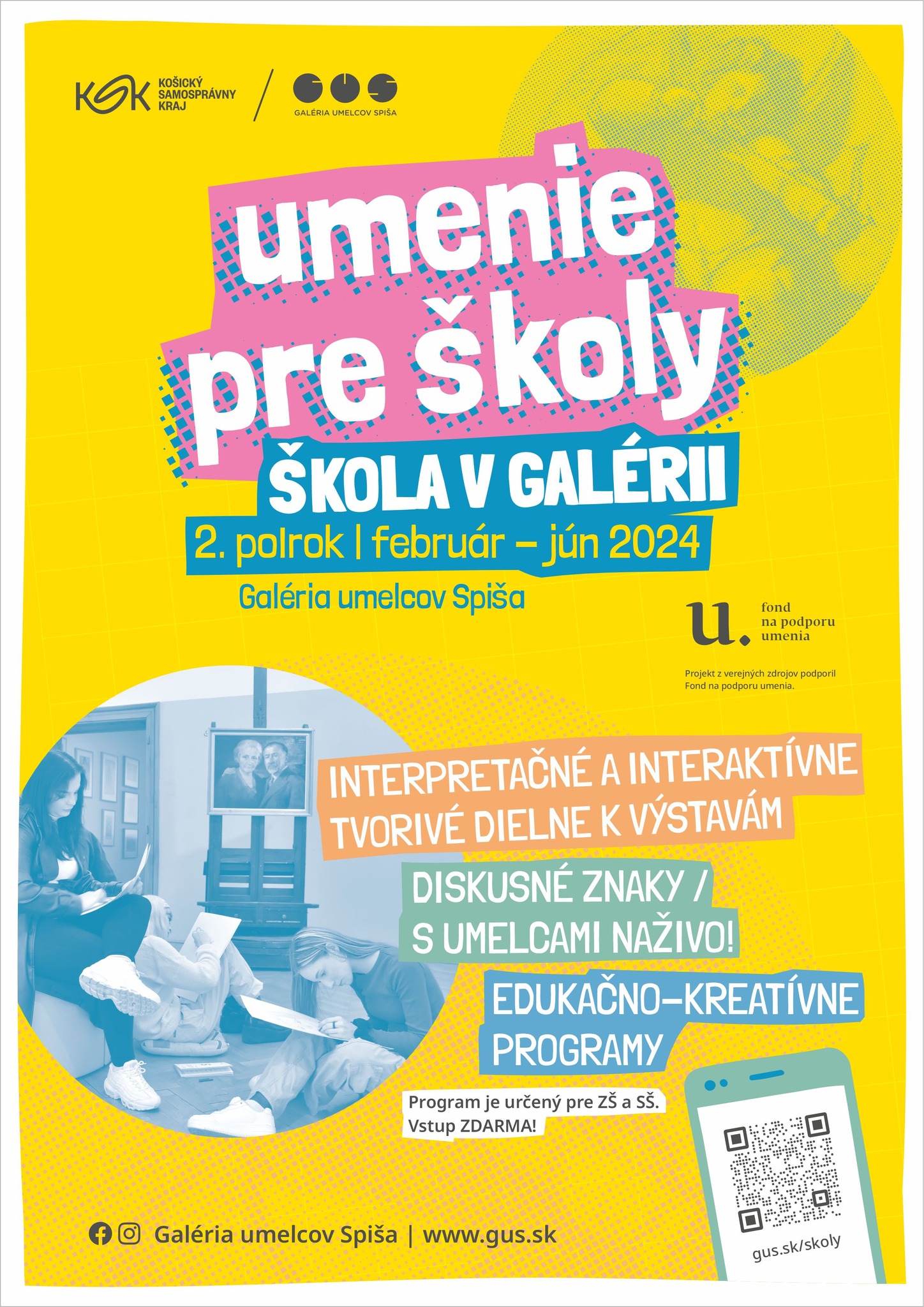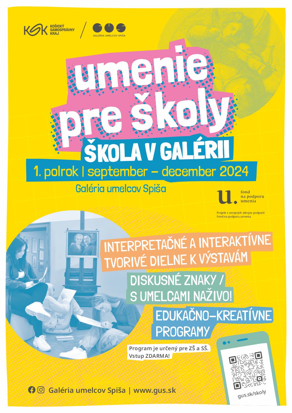 Projekt Škola v Galérii umelcov Spiša predstavuje koncept galerijnej pedagogiky zameraný na výchovu umením. Prezentačno-vzdelávacie aktivity ponúkajú bezprostredný kontakt so živým umením s fókusom na interpretačné výtvarné workshopy. Program je určený pre ZŠ a SŠ, so vstupom zdarma. Projekt z verejných zdrojov podporil Fond na podporu umenia.
