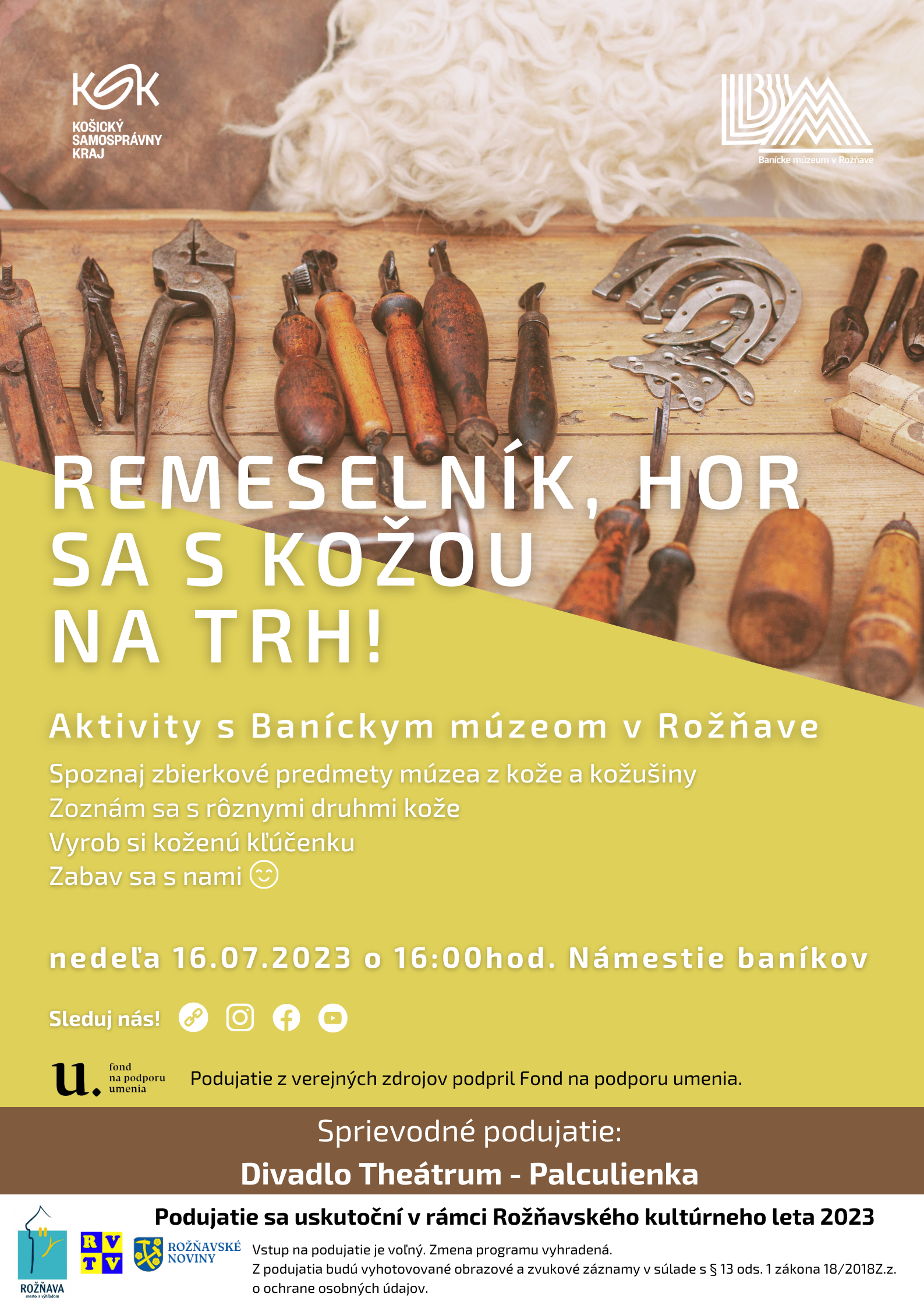 Banícke múzeum v Rožňave, kultúrne zariadenie Košického samosprávneho kraja v rámci Rožňavského kultúrneho leta 2023 odprezentuje širokej verejnosti múzejno-pedagogickú aktivitu s názvom Remeselník, hor sa s kožou na trh!. Účastníci podujatia sa môžu tešiť na zbierkové predmety múzea a na interaktívne hry. Zoznámia sa s rôznymi druhmi kože a vyrobia si vlastnú koženú kľúčenku.