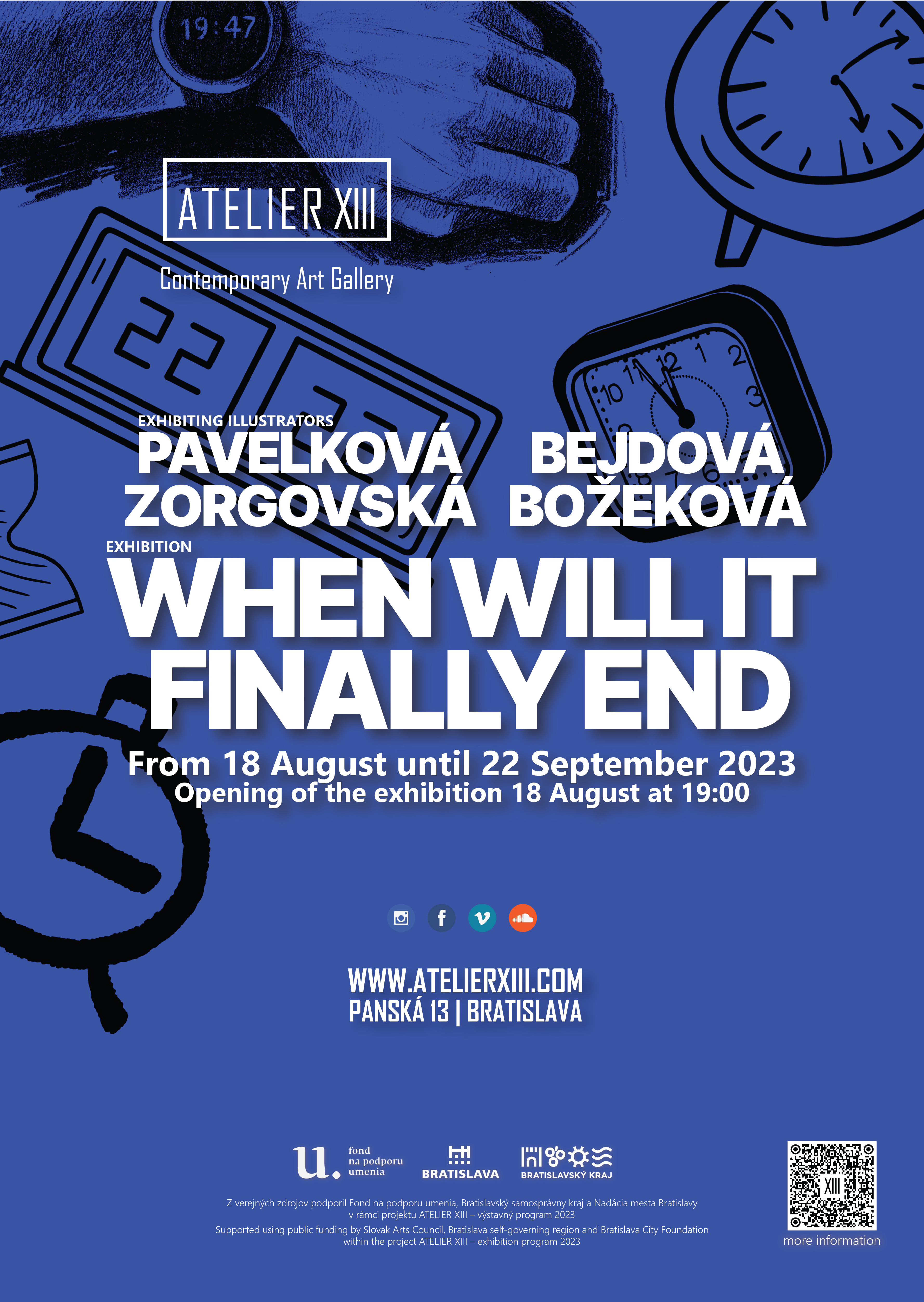 V piatok 18. 8. 2023 od 19:00 do 22:00 ťa radi privítame na otvorení výstavy diel ilustrátoriek Romany Bejdovej, Helgy Pavelkovej, Klaudie Zorgovskej a Alžbety Božekovej s názvom Kedy to už skončí.