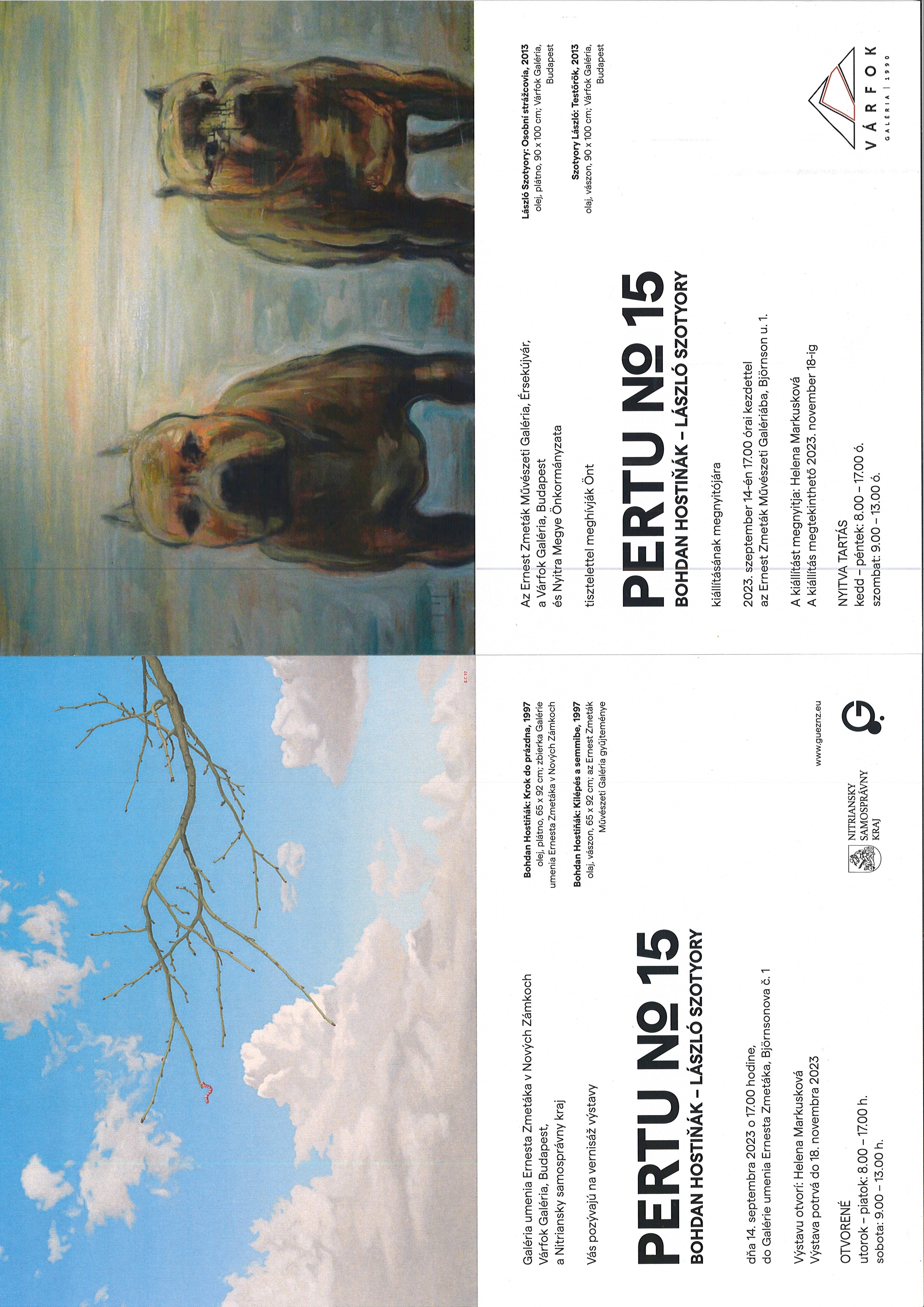 Galéria umenia Ernesta Zmetáka v Nových Zámkoch Vás pozýva na vernisáž výstavy PERTU NO15 Bohdan Hostiňák - László Szotyory, dňa 14. septembra 2023 o 17,00 hodine do Galérie umenia Ernesta Zmetáka v Nových Zámkoch. Výstavu otvorí Helena Markusková. Výstava potrvá do 18. novembra 2023.