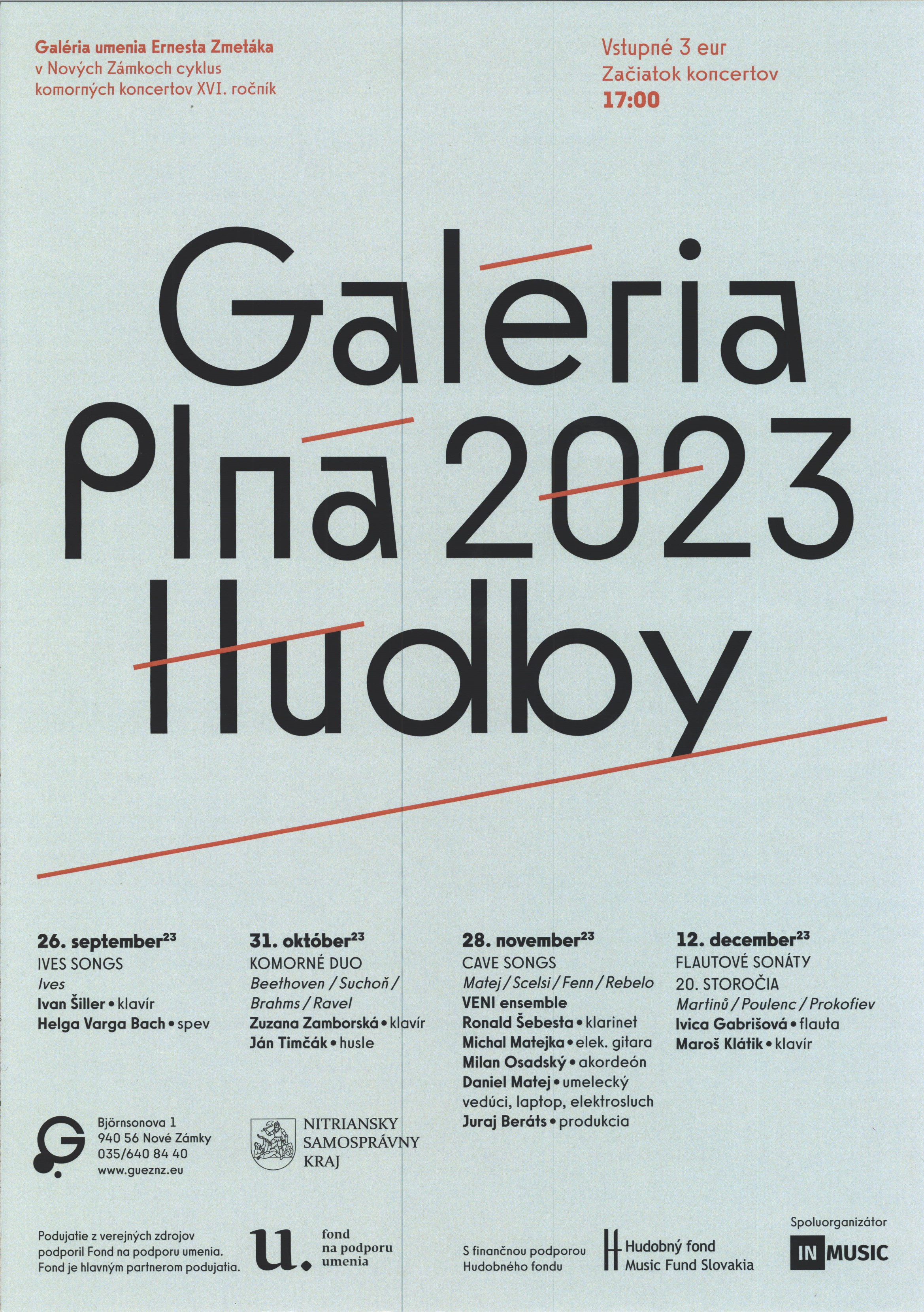 Galéria umenia Ernesta Zmetáka v Nových Zámkoch Vás pozýva na cyklus komorných koncertov XVI. ročník GPH 2023. Vstupné: 3,- Eur Začiatok koncertov: 17,00 h. Miesto: Galéria umenia Ernesta Zmetáka v Nových Zámkoch
