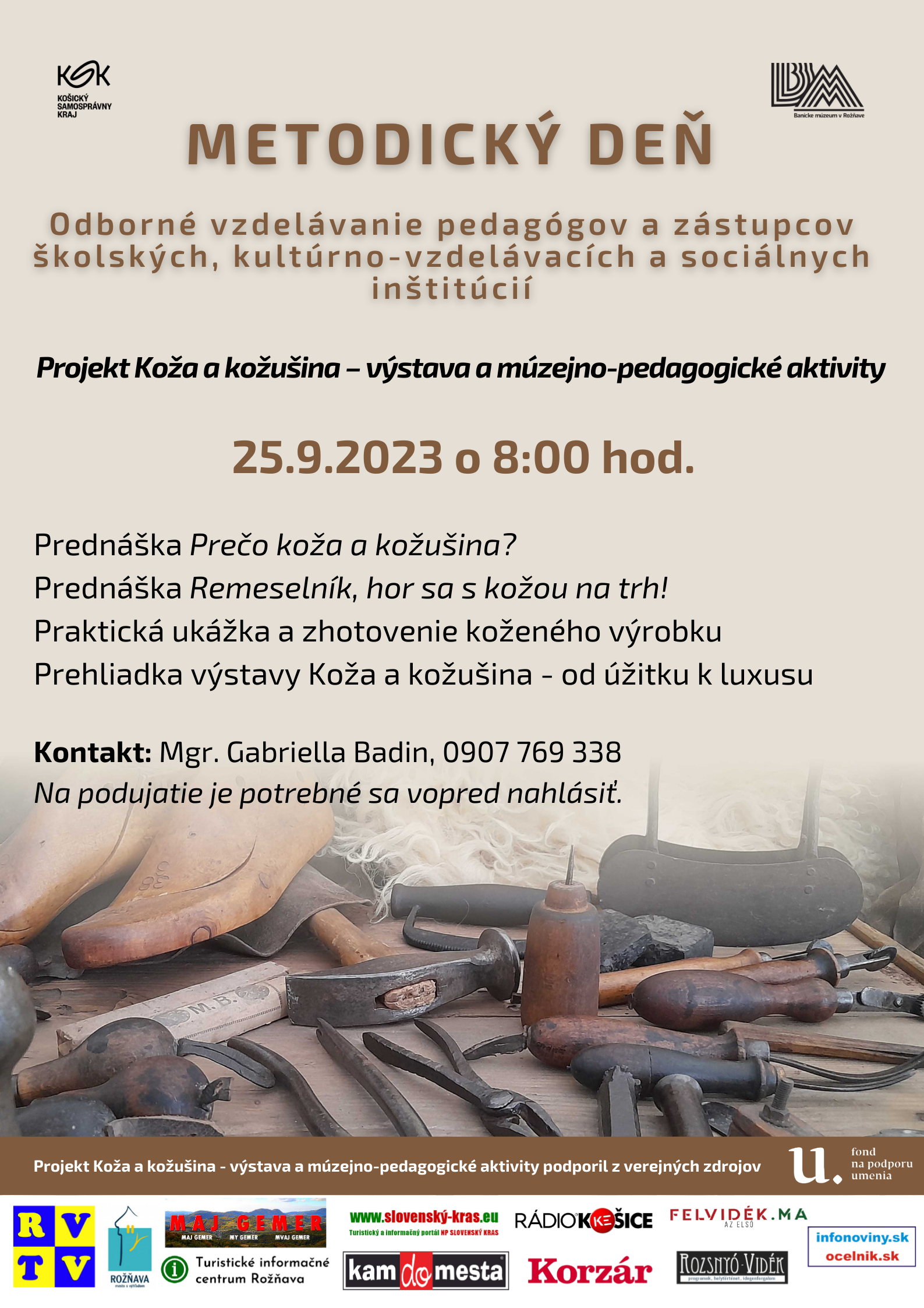 Banícke múzeum v Rožňave, kultúrne zariadenie Košického samosprávneho kraja, organizuje pre pedagógov a zástupcov kultúrno-vzdelávacích a sociálnych inštitúcií metodický deň. V Zážitkovom centre Sentinel /Šafárikova 43, 048 01 Rožňava/ si môžu záujemcovia vypočuť prednášky Prečo koža a kožušina? a Remeselník hor sa s kožou na trh!. Okrem prednášok absolvujú praktickú ukážku a zhotovia si kožený výrobok. Na záver sa môžu zúčastniť prehliadky výstavy Koža a kožušina - od úžitku k luxusu.