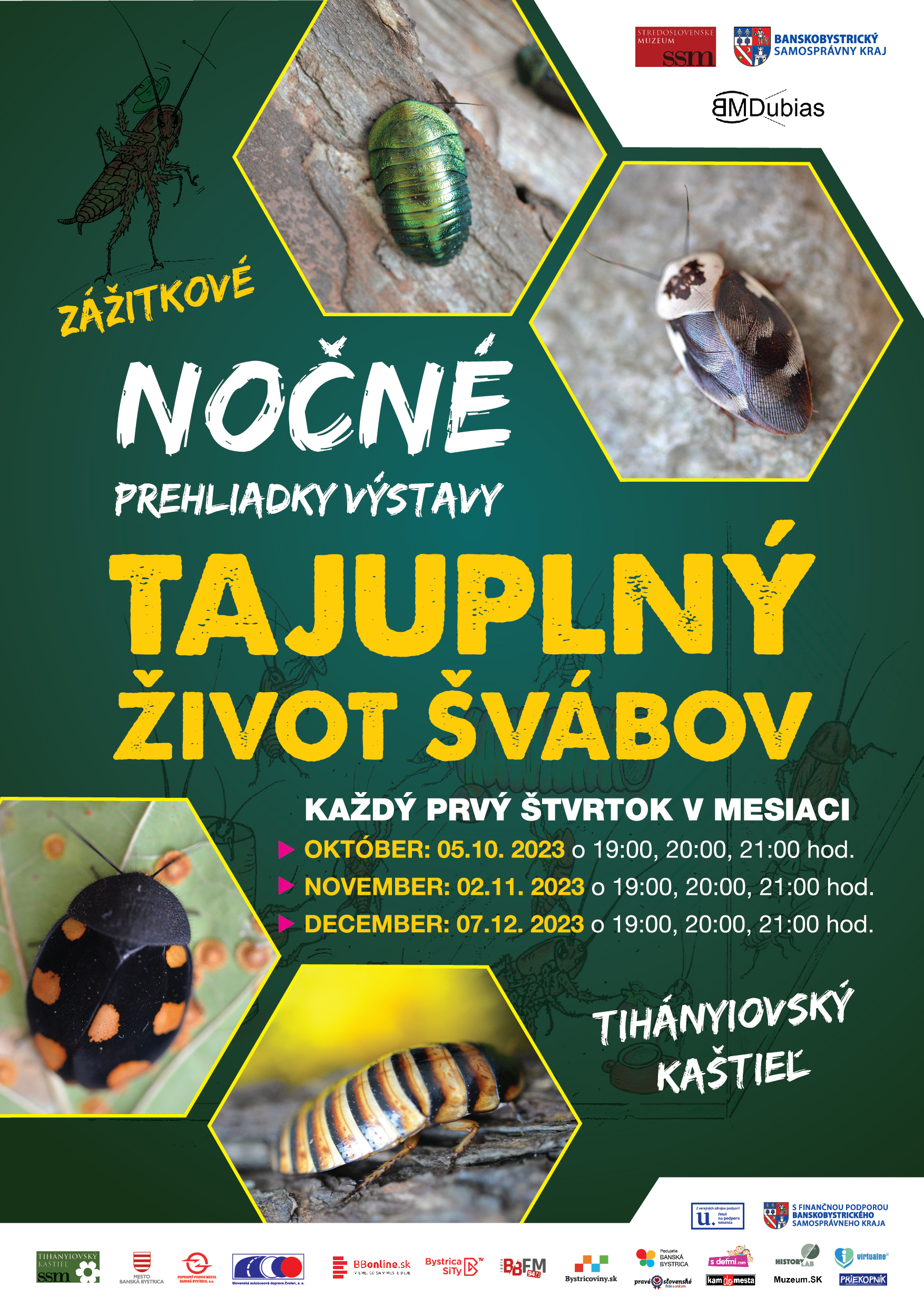 Nočné zážitkové prehliadky výstavy Tajuplný život švábov každý prvý štvrtok v mesiaci (5.10., 2.11., 7.12.) vždy o 19:00, 20:00 a 21:00.