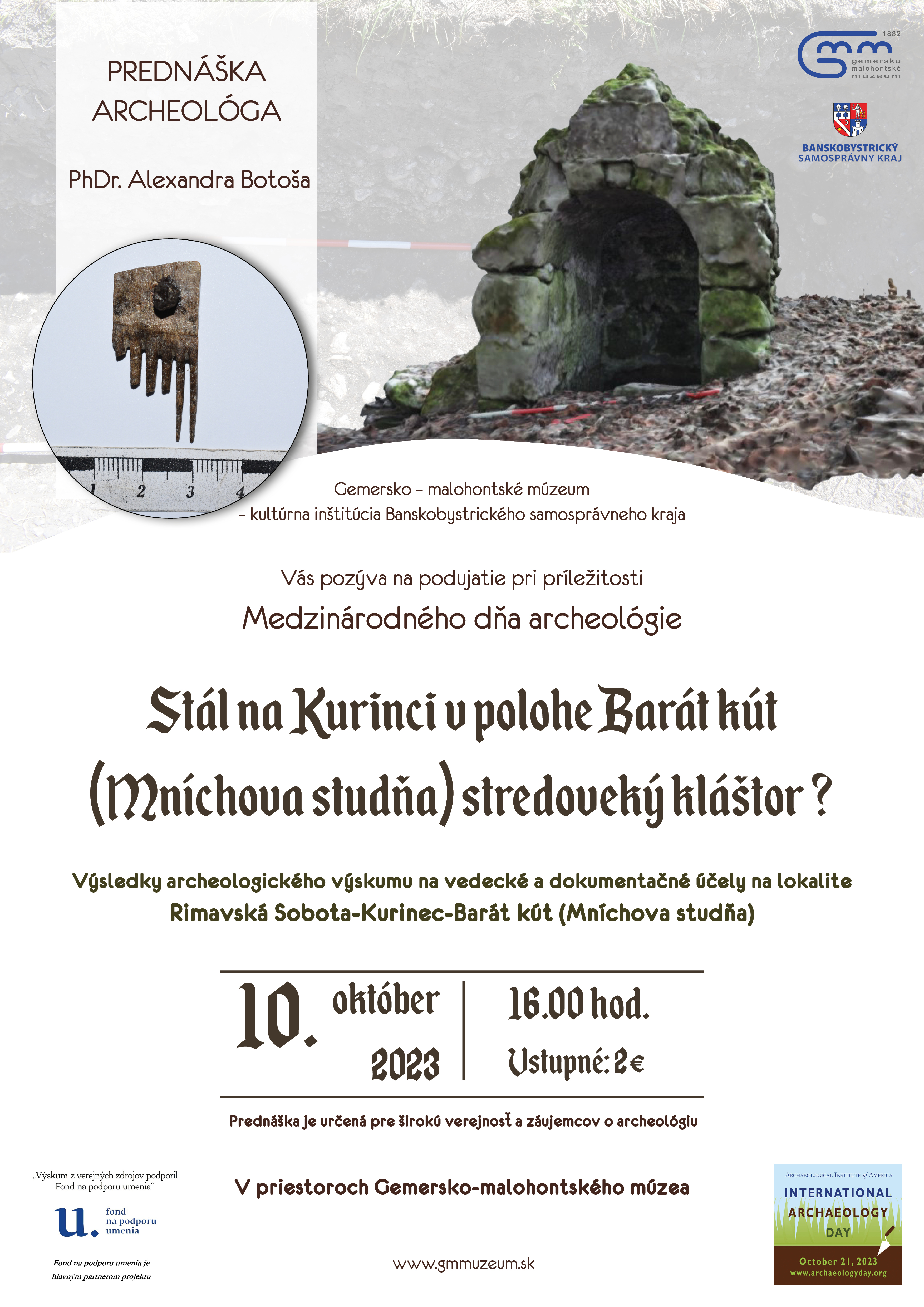 Archeológ múzea A. Botoš v prednáške s názvom „Stál na Kurinci v polohe Barát kút (Mníchova studňa) stredoveký kláštor ?“ predstaví výsledky archeologického výskumu na vedecké a dokumentačné účely na lokalite Rimavská Sobota-Kurinec-Barát kút (Mníchova studňa). V sondách sa preukázalo osídlenie z doby laténskej, z doby rímskej, zo včasného stredoveku, ako aj z vrcholného a neskorého stredoveku.