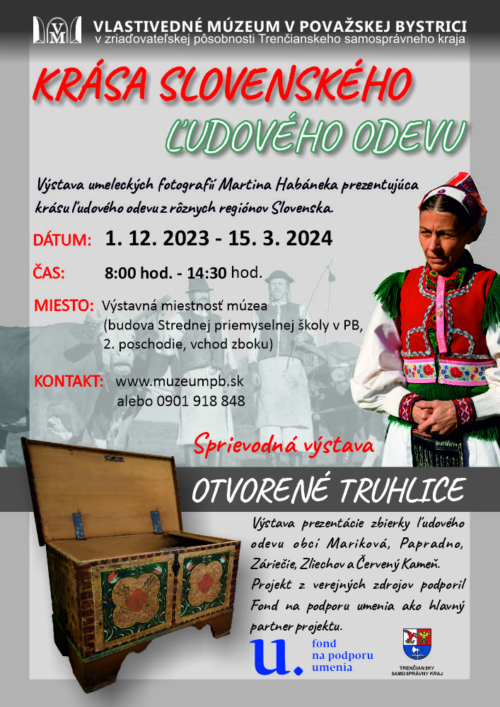 Zámerom projektu Otvorené truhlice bolo vytvorenie nového výstavného priestoru na prezentáciu zbierok ľudového odevu z fondu nášho múzea. V troch nových vitrínach sú vystavené ľudové odevy z lokalít: Záriečie, Dolný Lieskov, Zliechov, Červený Kameň, Papradno a Udiča.