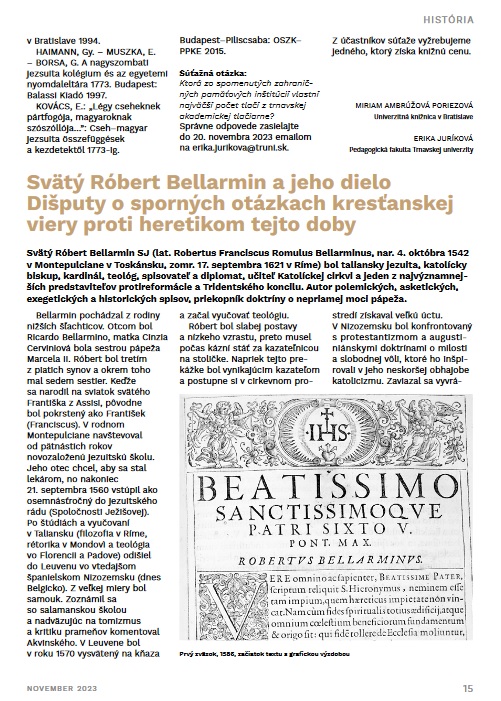 Štúdia - článok o zreštaurovanej knihe, publikovaný v novembri 2023: ŠEVČÍK, Milan. Svätý Róbert Bellarmin a jeho dielo Dišputy o sporných otázkach kresťanskej viery proti heretikom tejto doby. In: Novinky z radnice, november 2023, s. 15-18. https://www.trnava.sk/userfiles/file/Novinky_11_2023_web.pdf