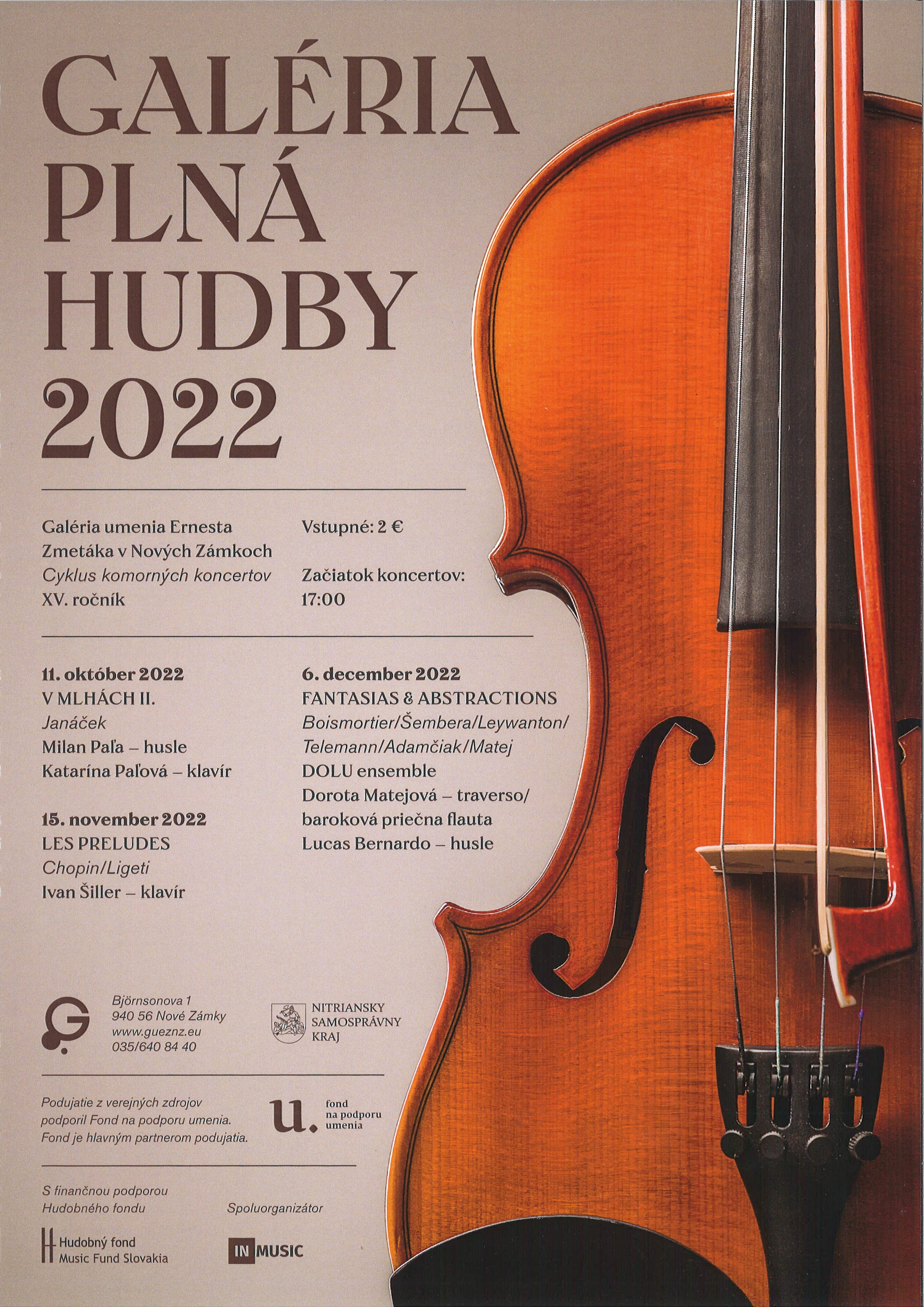 Galéria umenia Ernesta Zmetáka v Nových Zámkoch Vás pozýva na cyklus komorných koncertov XV. ročník. Termín koncertov: 11. október 2022 - V Mlhách II, 15. november 2022 - LES PRELUDES, 6. december 2022 - FANTASIAS & ABSTRACTIONS Vstupné: 2,. € Začiatok koncertov: 17:00 Miesto: Galéria umenia Ernesta Zmetáka v Nových Zámkoch