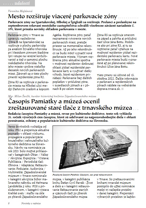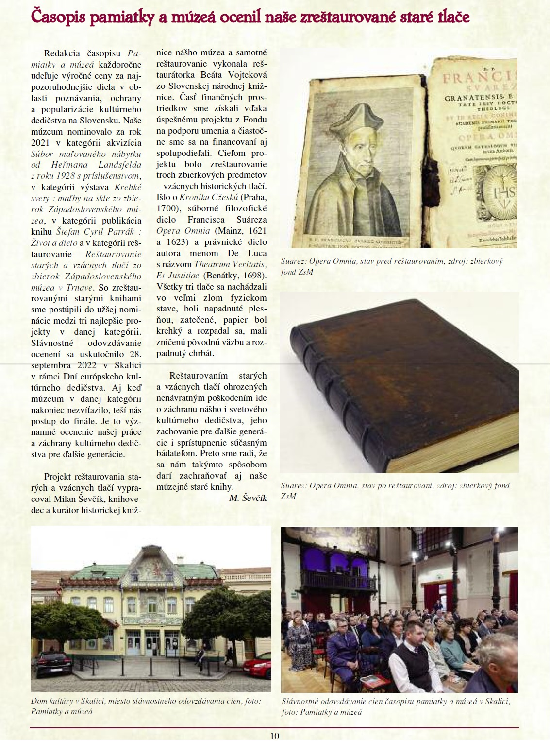 Článok prezentujúci zreštaurované staré tlače s finančnou podporou FPU a informujúci o udeľovaní výročných cien časopisu Pamiatky a múzeá