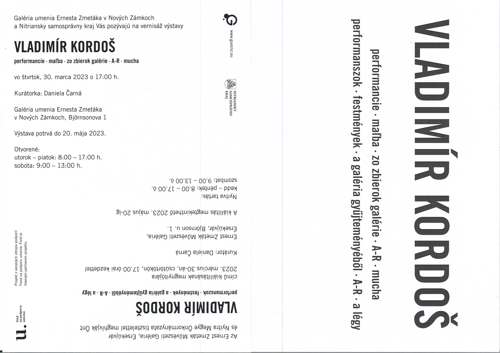 K výstave Vladimíra Kordoša/ performancie · maľba · zo zbierok galérie · A-R · mucha(30.3. – 20.5.2023) vyšiel katalóg. Projekt z verejných zdrojov podporil Fond na podporu umenia.