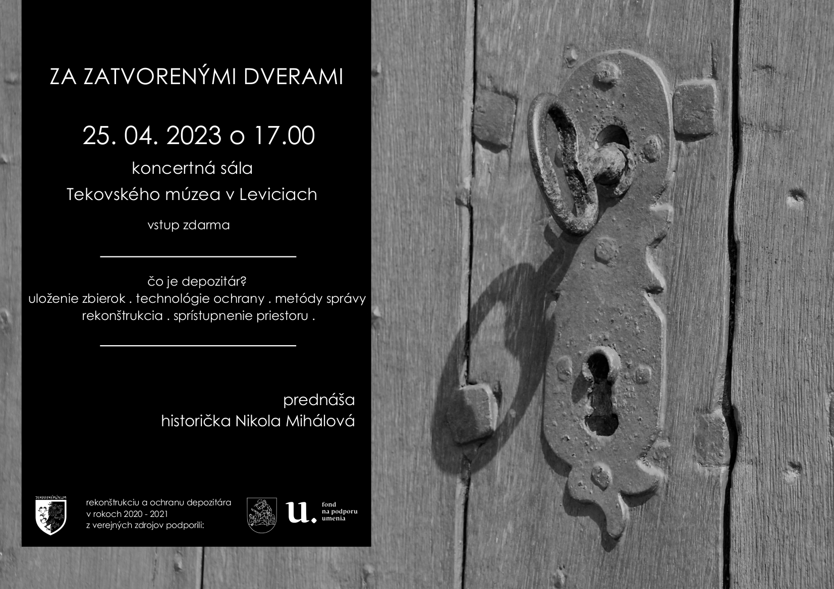 Tekovské múzeum v Leviciach pozýva na prednášku ZA ZATVORENÝMI DVERAMI. Stretneme sa 25. apríla o 17.00 v koncertnej sále múzea v Kapitánskej budove. Dozviete sa zaujímavosti zo zákulisia múzejnej praxe. Čo je depozitár? Ako múzejníci ochraňujú a uchovávajú zbierky. Ako sa depozitár rekonštruoval a aký je jeho režim. A na záver sa pozrieme aj za zatvorené dvere, kde sa návštevníci bežne nedostanú. Prednáša historička múzea, Nikola Mihálová. Vstup na prednášku je zdarma.