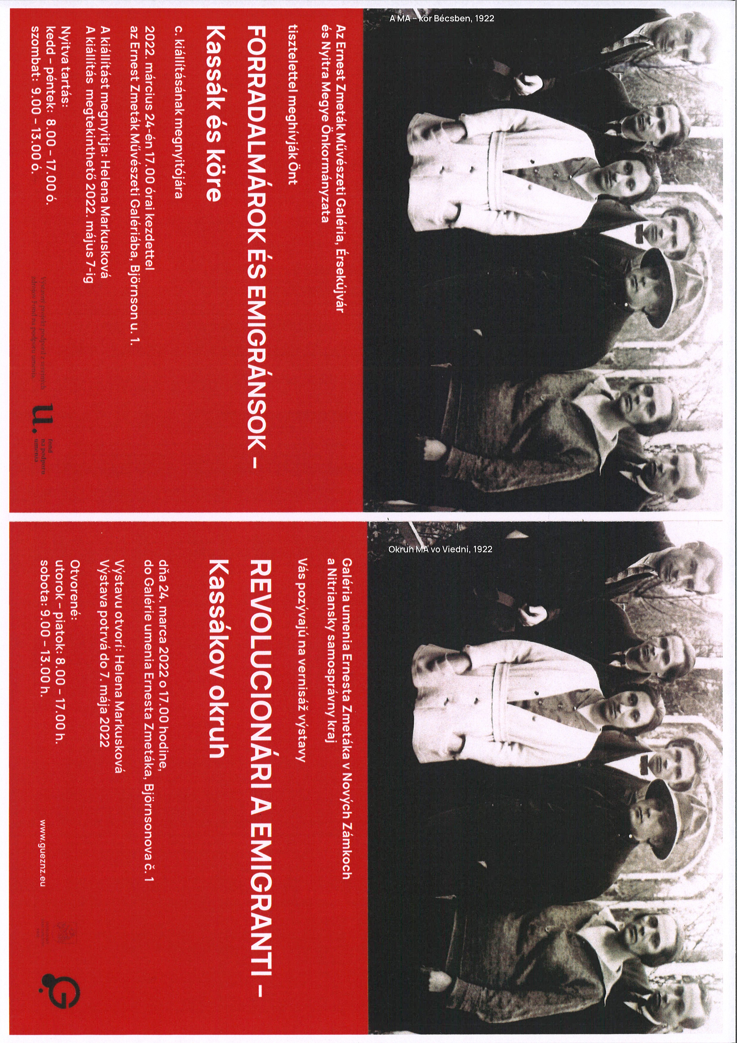 Galéria umenia Ernesta Zmetáka v Nových Zámkoch Vás pozývajú na vernisáž výstavy REVOLUCIONÁRI A EMIGRANTI - Kassákov okruh dňa 24. marca 2022 o 17,00 hodine. Výstavu otvorí: Helena Markusková Výstava potrvá do 7. mája 2022 Otvorené utorok - piatok: 8,00 - 17,00 h. sobota: 9,00 - 13,00 h.